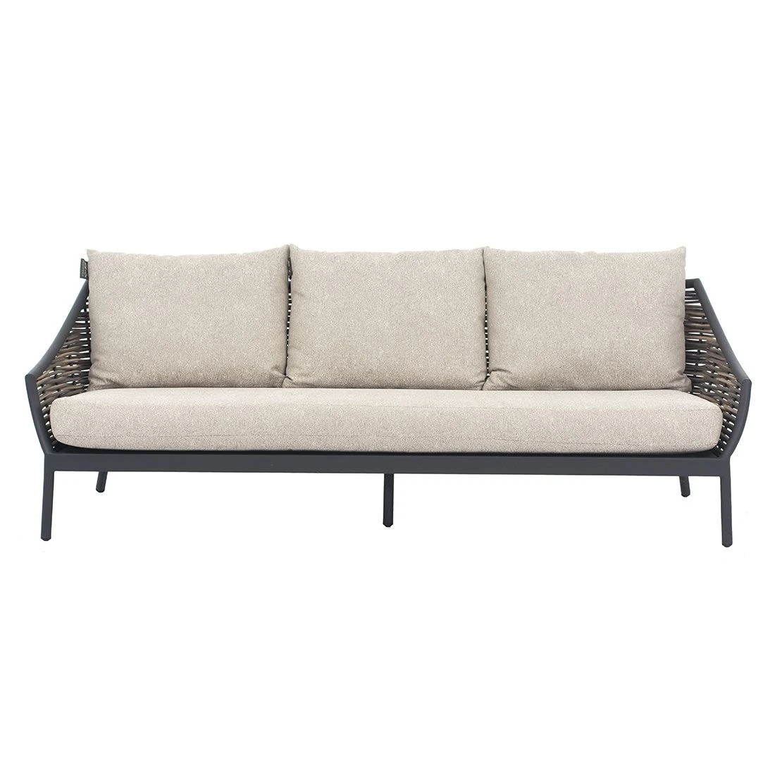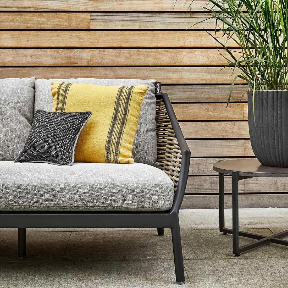 Highlight des Designs ist hierbei die Rückenlehne in Weidenoptik, die wirkt, als wären echte Weidezweige um die Rückenlehne geflochten. Einen modernen Touch erhält das Design durch das mattschwarze Aluminiumgestell, das auch einen Rahmen rund um das Geflecht bildet und dieses abschließt.