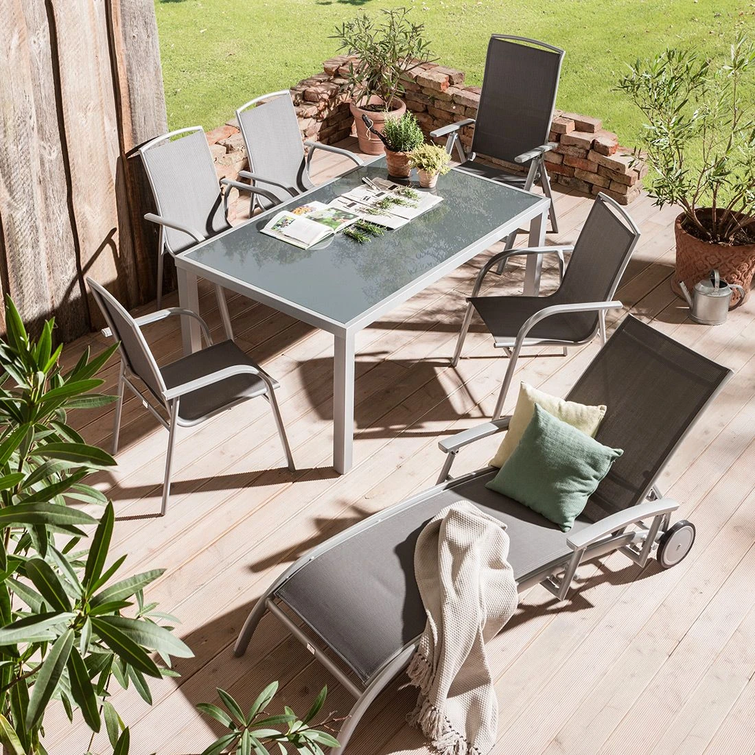 Für die Herstellung des Gestells wird hochwertiges und wetterfestes Aluminium verwendet. Für eine attraktive Optik ist das Gestell im Farbton Silber gehalten. Für die Bespannung der Sitzfläche wird hochwertiges Textilene verwendet. Es zeichnet sich durch eine hohe Robustheit gegenüber Hitze und Frost aus und ist leicht zu reinigen. Die Sitzfläche ist in ansprechendem Anthrazit gehalten.