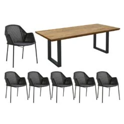 Damit das Gartenmöbel-Set optisch ansprechend ist, sind das Gestell und die Sitzfläche im Farbton Black gehalten. Die robusten Metallgestelle aus Stahl garantieren eine hohe Stabilität. Im Setangebot enthalten ist auch ein passender Tisch. Die Tischplatte wird aus recyceltem, also wiederverwertetem, Teak gefertigt. Hier werden bewusst Altersspuren wie Kerben oder Nagellöcher erhalten, so dass jeder Tisch ein wahres Unikat ist. Passend zum Gesamtbild des Gartenmöbel-Sets begeistert die Tischplatte mit ihrer Farbgebung in Natur. Als klassische Design-Komponente fungiert das geradlinige Vierfußgestell. Die rechteckige Form ermöglicht es Ihnen, den Tisch in Ecken und an Häuserwänden platzsparend einzusetzen.