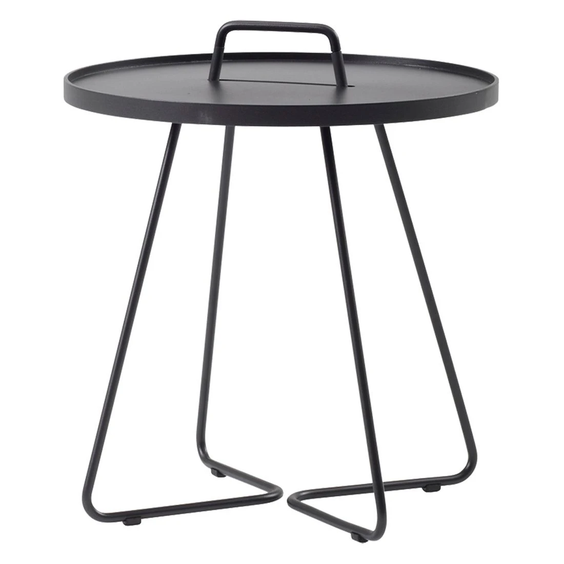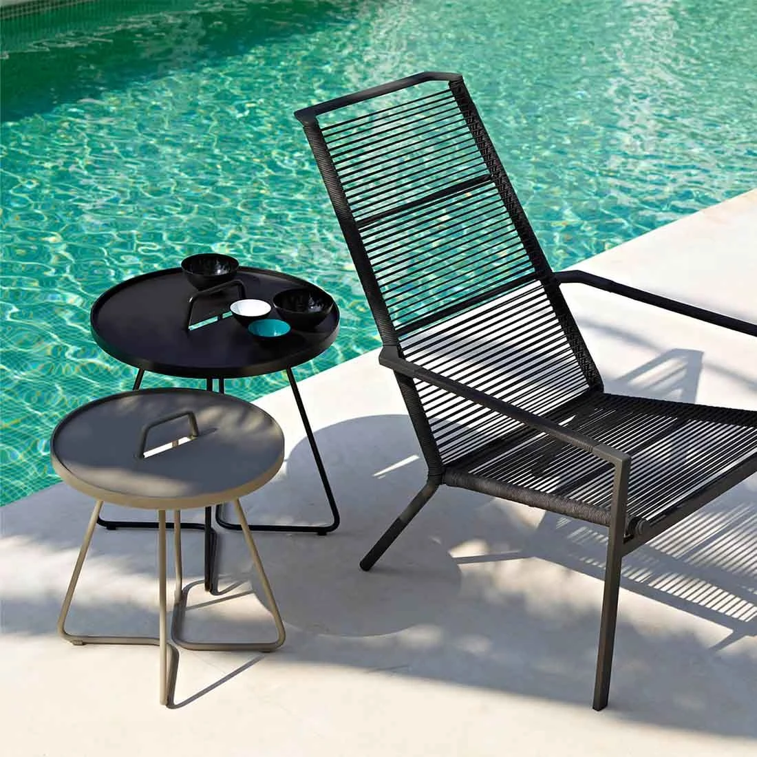 Die reduzierte Größe macht den Beistelltisch On-the-move von Cane-Line zu einer hilfreichen Ergänzung eines Loungesets auf dem Balkon.