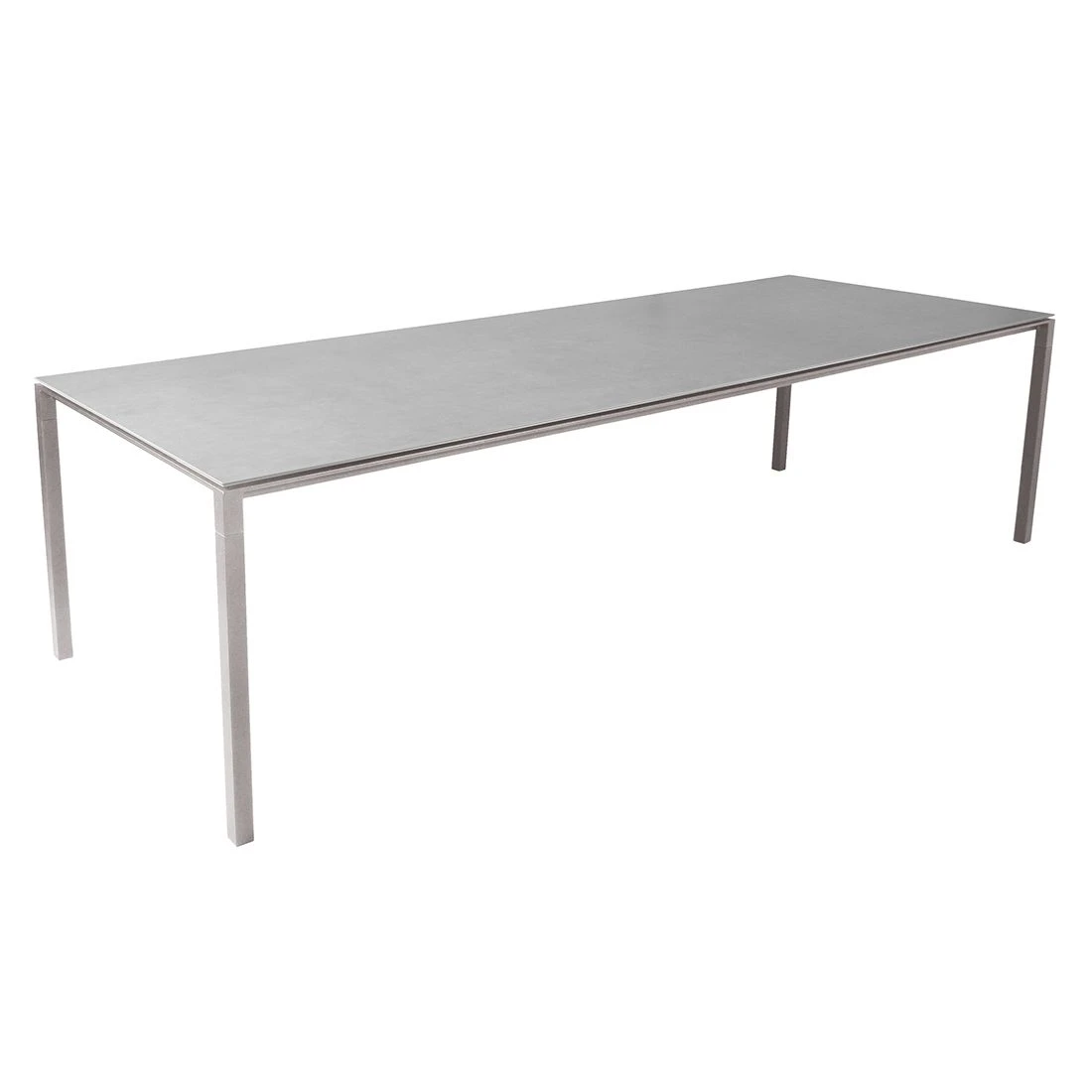 Als Gestellmaterial dient hochwertiges Aluminium. Farblich ist das Gestell in Taupe gehalten. Keramik ist das Material, das für die Tischplatte gewählt wird. Das robuste Material ist nicht so schwergewichtig wie Naturstein, sorgt allerdings ebenso für windsicheren Halt auf der Terrasse und im Garten. Für ein elegantes Gesamtbild erscheint die Platte in der Farbe Concrete Grey. Das klassische Vierfuß-Gestell garantiert Ihnen maximale Beinfreiheit. Das Design des Gartentisches ist klassisch rechteckig gehalten.