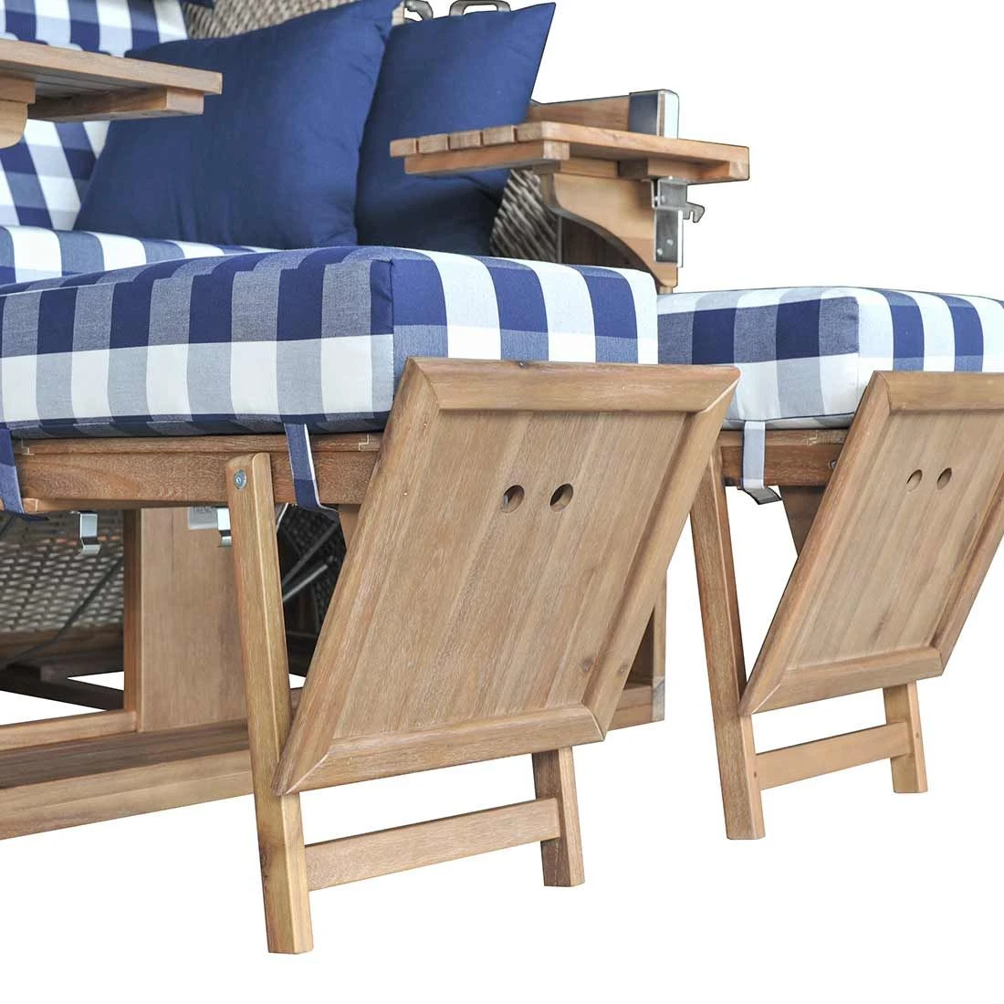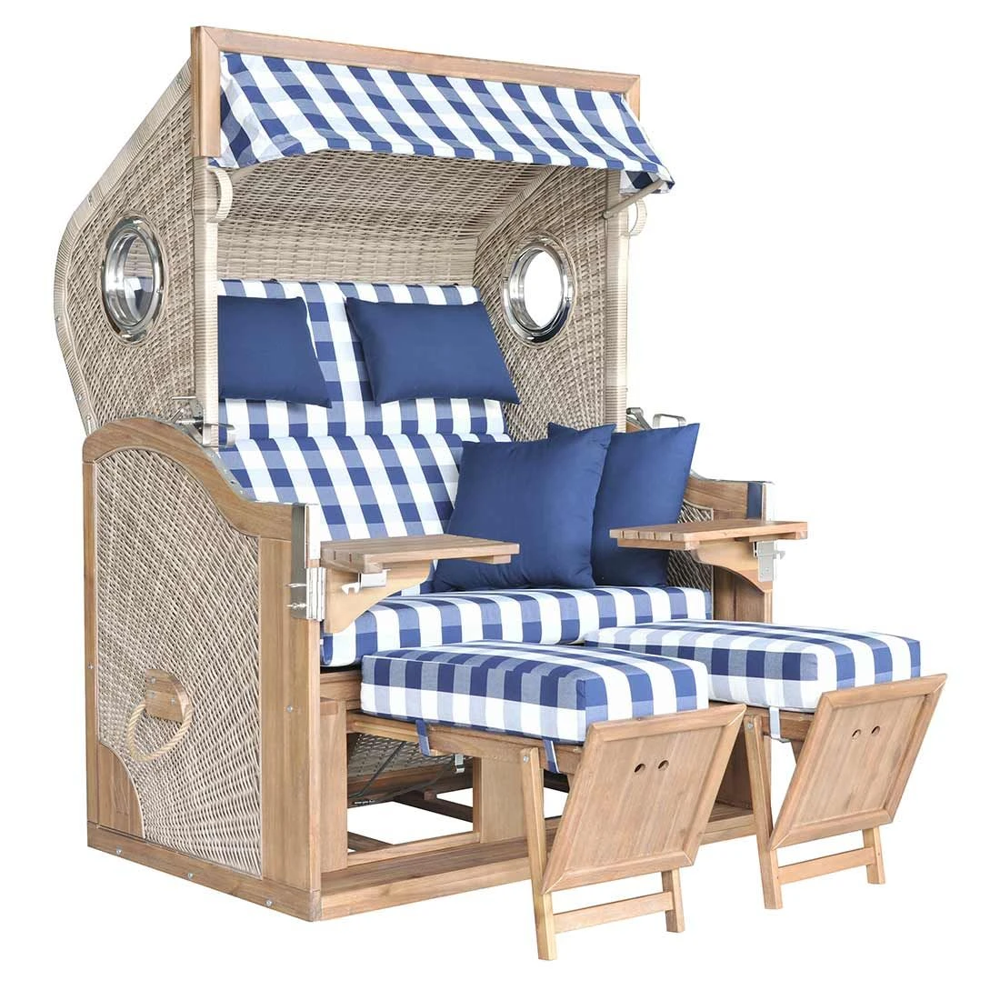 Der Strandkorb selbst besteht aus Akazienholz sowie Polyrattan-Geflecht. Beides harmoniert hervorragend miteinander. Das Grundgerüst des Strandkorbs ist in Braun gehalten. Darüber hinaus begeistert der Strandkorb Pure Greenline im Farbton Braun. Als weiterer Hingucker und komfortables Highlight fungiert die Sitzfläche (Blau-Weiß). Zusammen mit den anderen Bestandteilen des Strandkorbs ergibt sich ein harmonisches Gesamtbild.