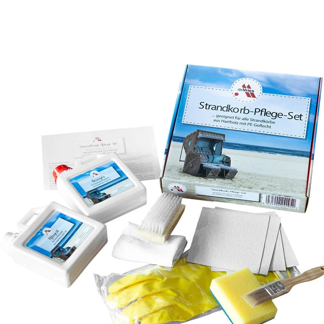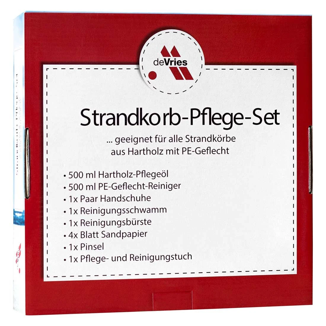 Sie möchten Ihren Strandkorb regelmäßig pflegen, damit Sie auch nach vielen Jahren Freude daran haben? Dann entscheiden Sie sich jetzt für das passende deVries Pflegeset. Dieses Set eignet sich für alle Strandkörbe aus Hartholz mit PE-Geflecht.