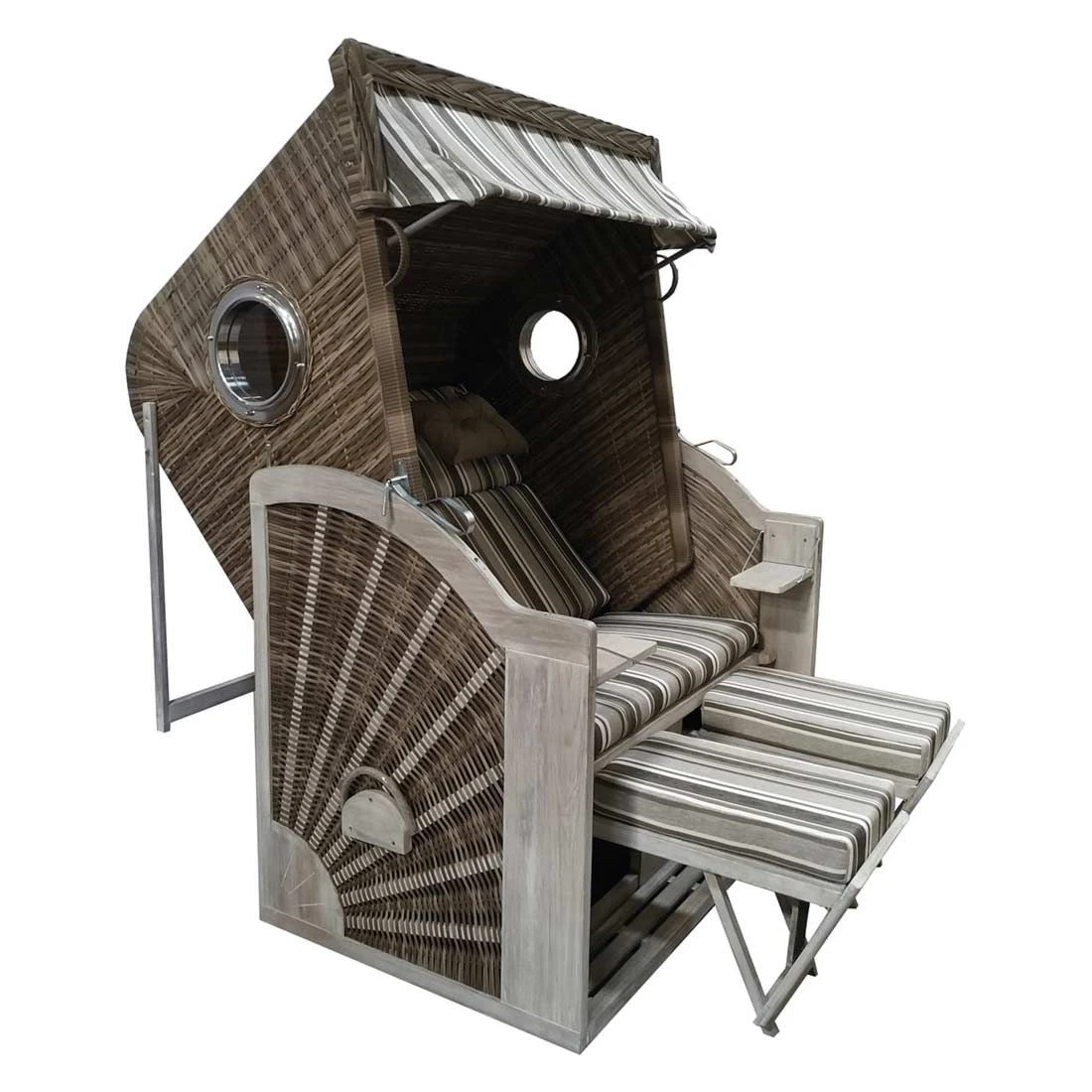 Holen Sie sich mit dem exklusiven deVries Strandkorb Pure Cliff XL traumhafte Entspannung wie im Urlaub direkt in Ihr Zuhause. Durch die Verbindung von modernem Geflecht und hochwertigem Massivholz (Polyrattan/Pinienholz) ist dieser Strandkorb nicht nur überaus gemütlich, sondern zudem sehr stabil und robust. Die Kombination der unterschiedlichen Materialien macht dieses Möbelstück darüber hinaus besonders wertig, wodurch es sich auf jedem Balkon und in jedem Garten sehen lassen kann. Dank der weiteren Funktionalitäten wie 2 Klapptischen und eleganten Bullaugen aus Aluminium erfüllt der Strandkorb jeglichen Wunsch nach Komfort. Um das Urlaubsgefühl passend abzurunden, bringt der Strandkorb noch einen mehrfach verstellbaren Rücken mit, damit sich Ihr Zuhause in eine echte Wohlfühloase verwandelt.