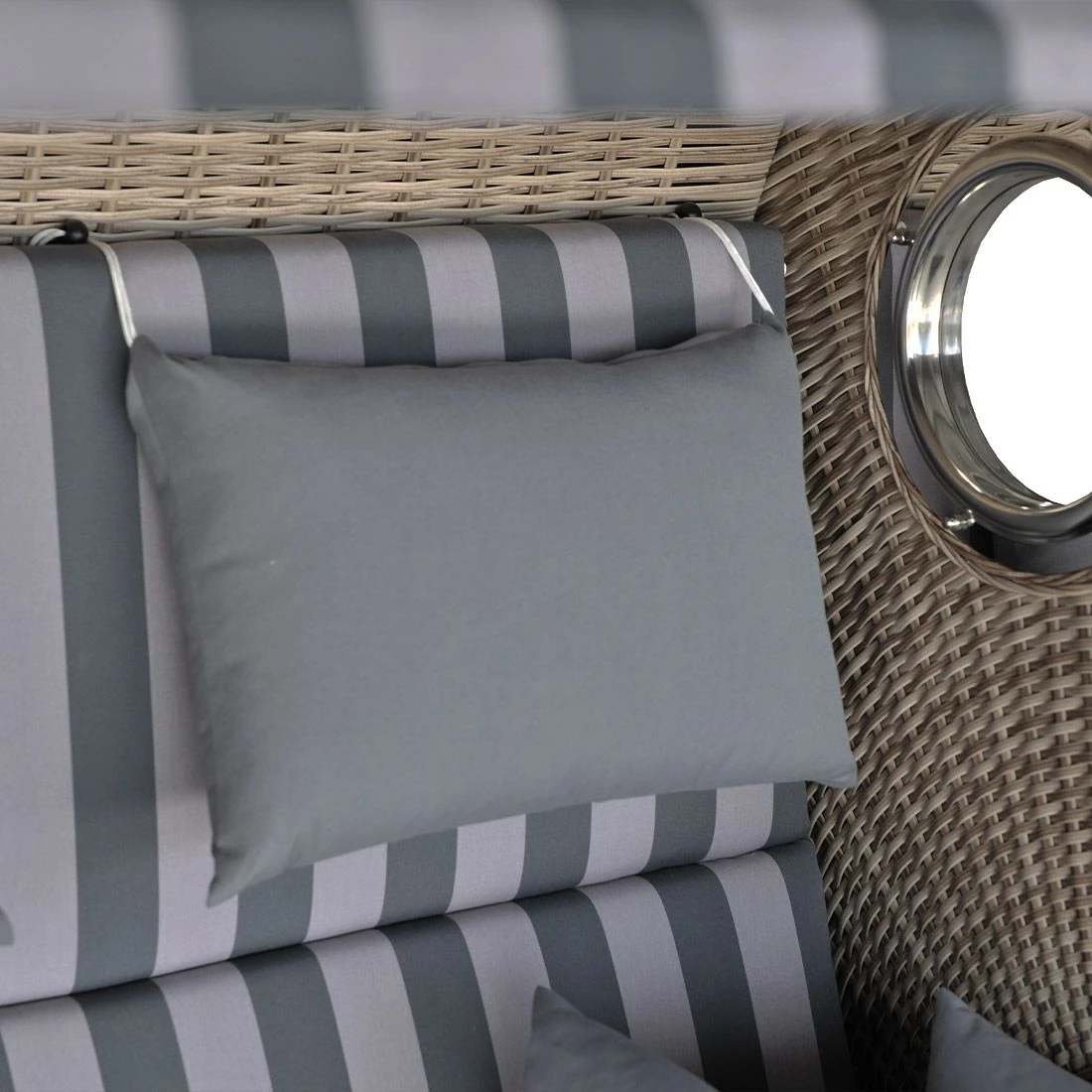 Der Strandkorb selbst besteht aus Akazienholz sowie Polyrattan-Geflecht. Beides harmoniert hervorragend miteinander. Das Grundgerüst des Strandkorbs ist in Braun gehalten. Äußerlich überzeugt der Strandkorb Pure Greenline mit seinem Polyrattan-Geflecht im Farbton Braun. Als weiterer Hingucker und komfortables Highlight fungiert die Sitzfläche (Grau-Weiß). Zusammen mit den anderen Elementen des Strandkorbs ergibt sich ein harmonisches Gesamtbild.