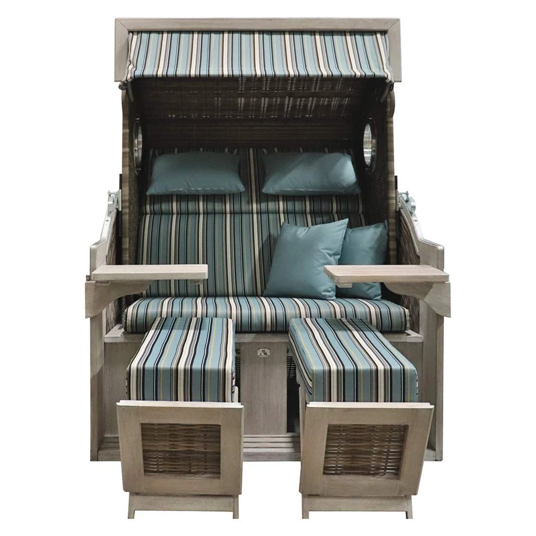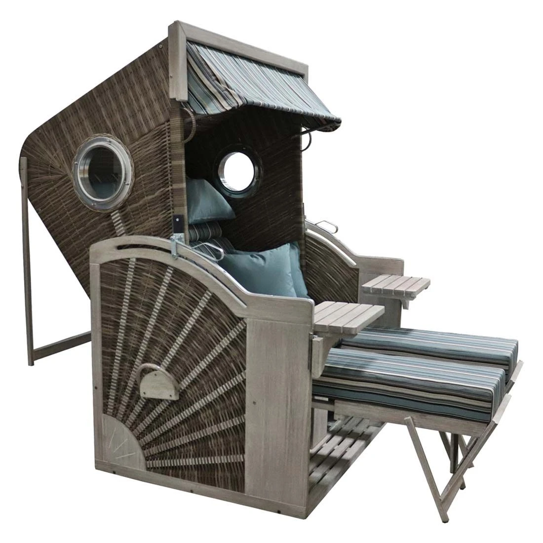Holen Sie sich mit dem exklusiven deVries Strandkorb Pure Seaside L traumhafte Entspannung wie im Urlaub direkt in Ihr Zuhause. Durch die Verbindung von modernem Geflecht und hochwertigem Massivholz (Polyrattan/Pinienholz) ist dieser Strandkorb nicht nur überaus gemütlich, sondern zudem sehr stabil und robust. Die Kombination der unterschiedlichen Materialien macht dieses Möbelstück darüber hinaus besonders wertig, wodurch es sich auf jedem Balkon und in jedem Garten sehen lassen kann. Dank der weiteren Funktionalitäten wie 2 schwenkbaren Cocktailtischen und eleganten Bullaugen aus Aluminium erfüllt der Strandkorb jeglichen Wunsch nach Komfort. Um das Urlaubsgefühl passend abzurunden, bringt der Strandkorb noch einen mehrfach verstellbaren Rücken mit, damit sich Ihr Zuhause in eine echte Wohlfühloase verwandelt.
