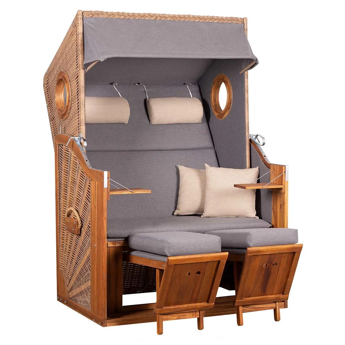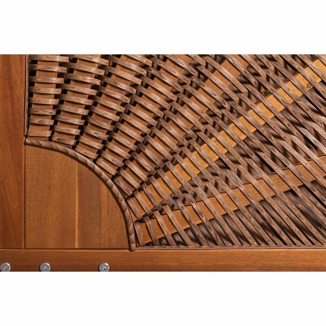 Der Strandkorb selbst besteht aus Akazienholz sowie Kunststoffgeflecht. Beides harmoniert hervorragend miteinander. Das Grundgerüst des Strandkorbs ist in Akazie Natur gehalten. Äußerlich begeistert der Strandkorb Trend mit seinem Kunststoffgeflecht im Farbton Walnuss.