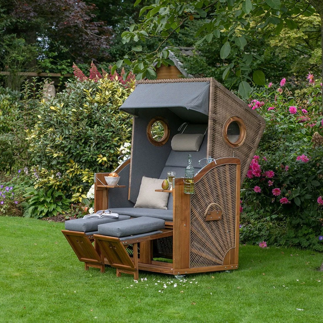Holen Sie sich mit dem bequemen deVries Strandkorb Entspannung wie im Urlaub direkt in Ihr Zuhause. Aufgrund der Kombination von modernem Geflecht und hochwertigem Massivholz ist dieser Strandkorb nicht nur äußerst gemütlich, sondern zudem sehr stabil und robust. Die Verbindung der unterschiedlichen Materialien macht dieses Möbelstück besonders wertig, wodurch es sich auf jeder Terrasse und in jedem Garten sehen lassen kann. Dank der zahlreichen Verstellmöglichkeiten sowie der weiteren Individualisierungsmöglichkeiten können Sie diesen Strandkorb genau auf Ihre Bedürfnisse abstimmen. Um das Urlaubsfeeling passend abzurunden, bringt der Strandkorb noch reichlich Zubehör mit, damit sich Ihr Zuhause in eine traumhafte Wohlfühloase verwandelt.