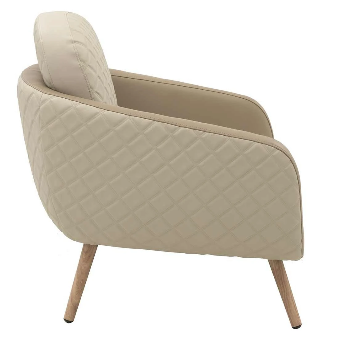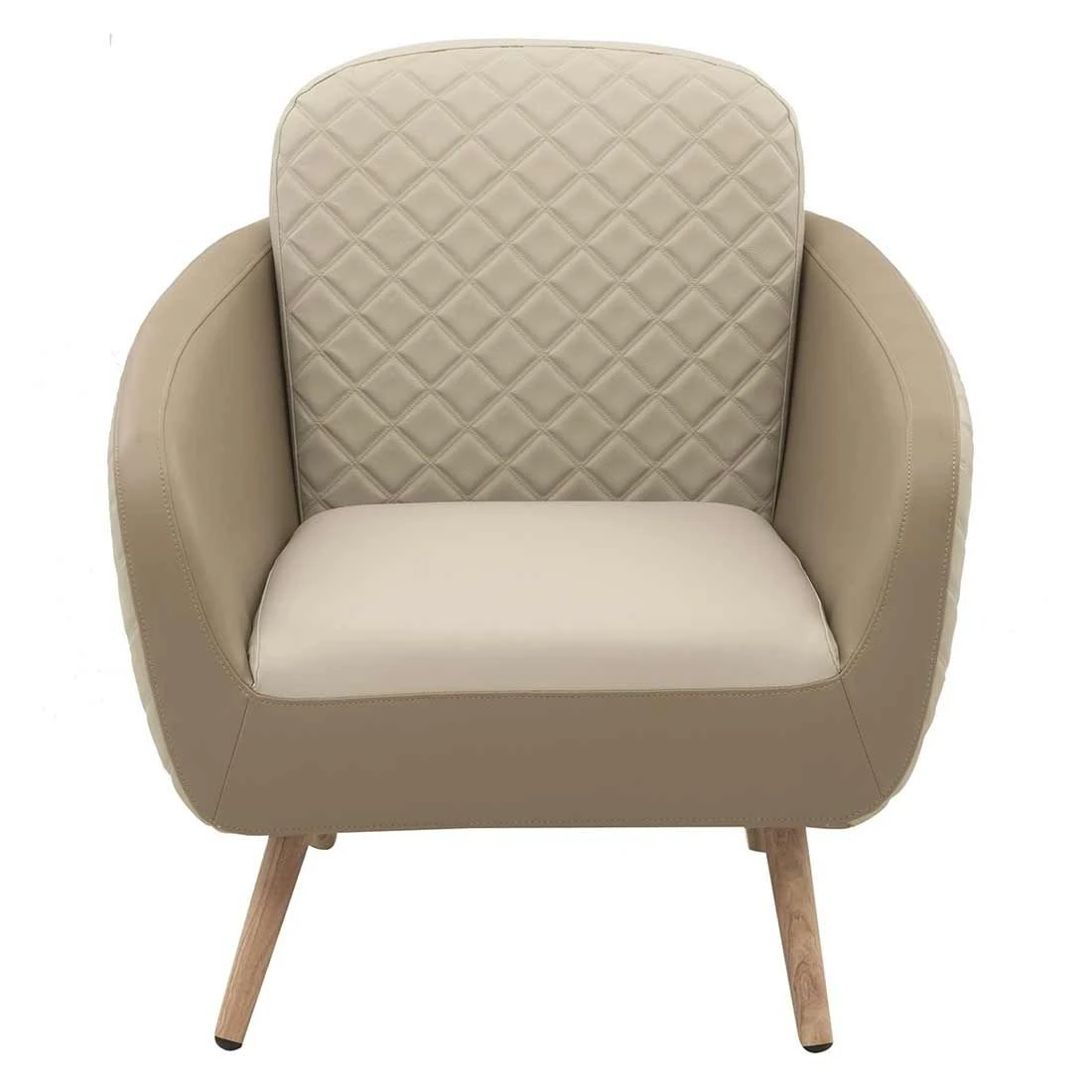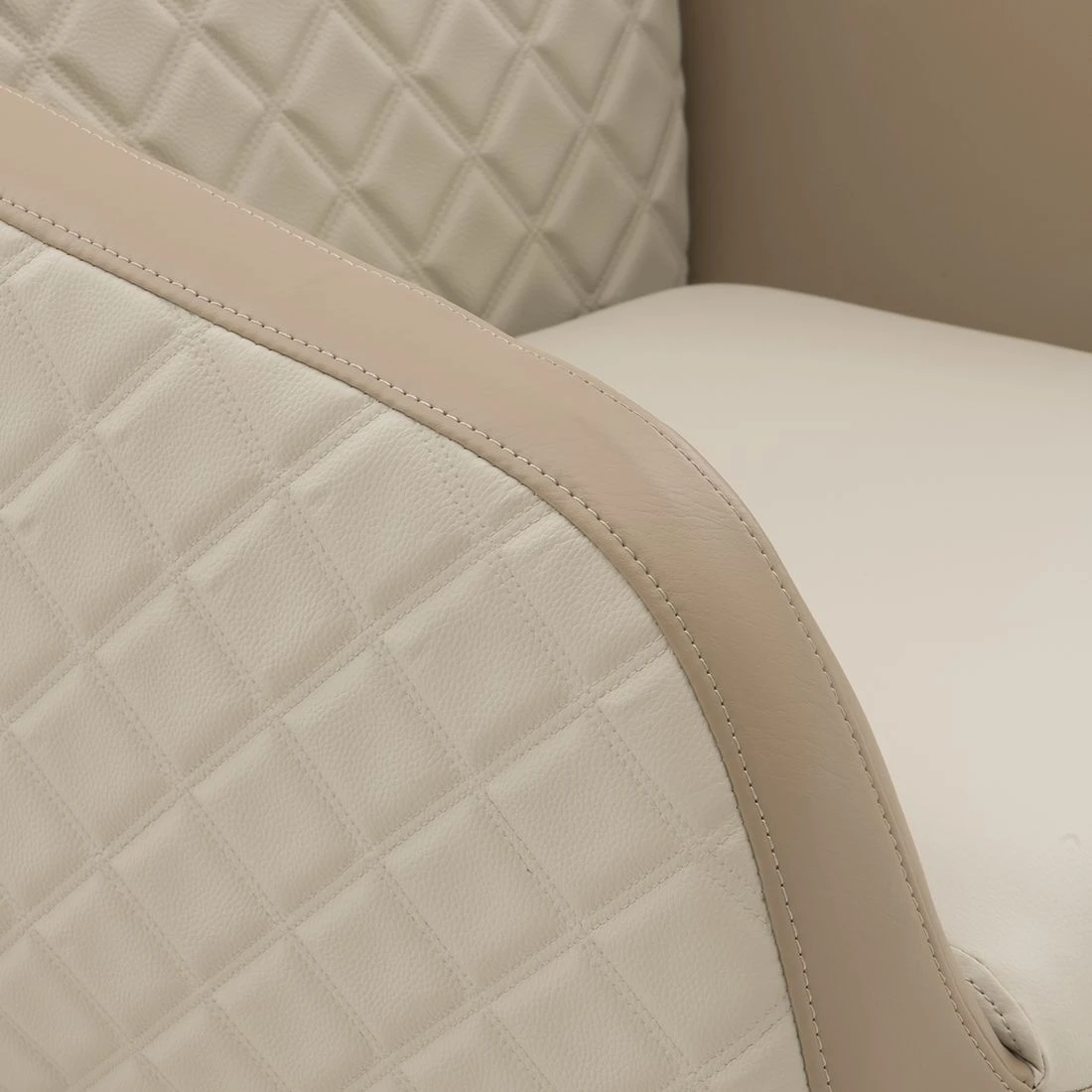 Der Kunstlederbezug ist zweifarbig und an Rücken- und Armlehne durch eine Steppung in Rautenform verziert. Er besteht aus MarinaPlus, einem für die Outdoor-Nutzung entwickelten synthetischen Leder, das Wind und Wetter sowie Hitze und Frost standhält. Dennoch ist das Material weich und komfortabel. Wer das Gartenmöbel dennoch schützen möchte, kann die dem Loungessel beiliegende Schutzhülle verwenden. Diese befindet sich unterhalb des Sessels in einer mit Reißverschluss gearbeiteten Tasche innerhalb des Gestells.