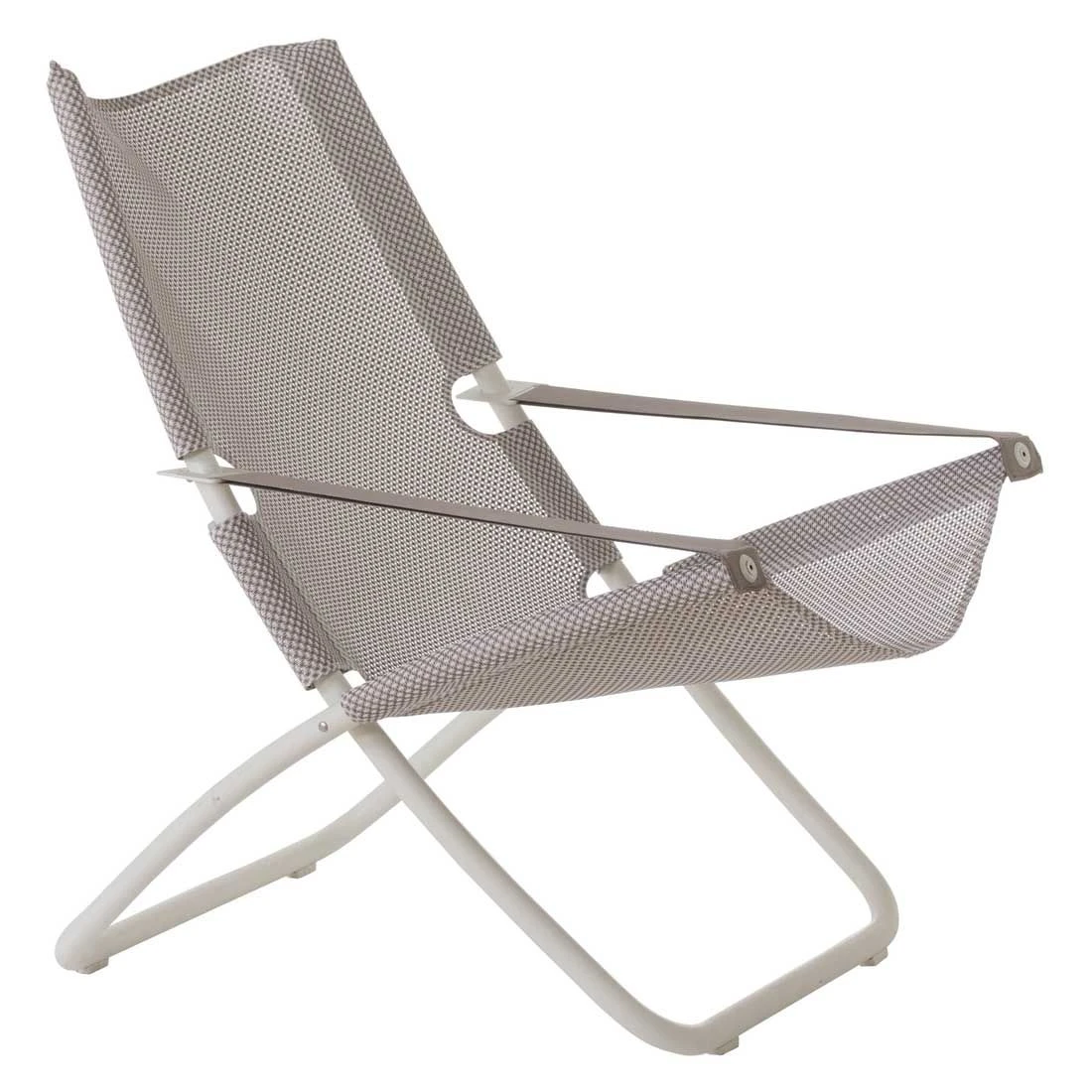 Als stabilen Unterbau wird für das Gestell robuster Stahl gewählt. Farblich ist dieses in Weiß gehalten. Die Sitzfläche wird mit Textilene bespannt. Dieses Material ist reiß- und wetterfest und zeichnet sich durch eine hohe Beständigkeit gegenüber Hitze und Frost aus. Darüber hinaus ist Textilene leicht zu säubern. Die Sitzfläche ist in ansprechendem Eis gehalten.