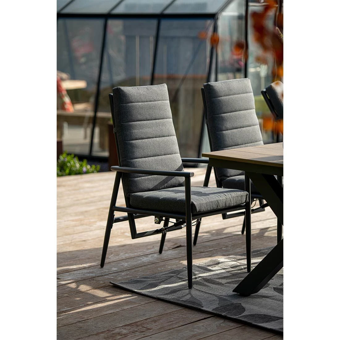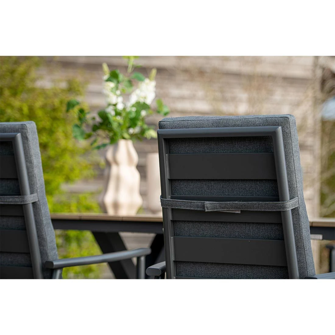 Das Gestell wird aus Aluminium gefertigt. Das geringe Eigengewicht des Materials macht den Gartensessel zu einem robusten, aber dennoch leicht zu transportierenden Sitzmöbel auf Ihrer Terrasse. Für eine attraktive Optik ist das Gestell im Farbton Carbon Black gehalten. Als hochwertiges Material für den Bezug kommt ein Polyester-Stoff zum Einsatz. Er ist sehr strapazierfähig und bietet somit die idealen Voraussetzungen für den Einsatz im Freien. Farblich begeistert der Bezug in elegantem Mystic Grey.