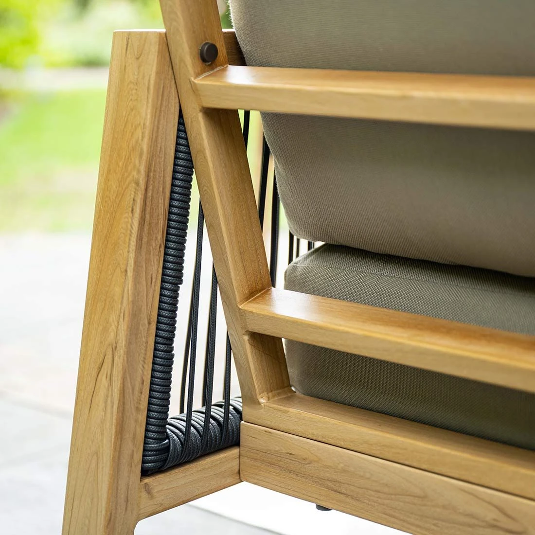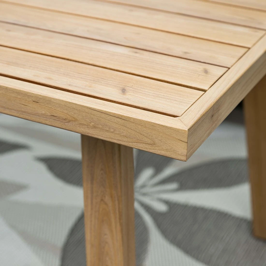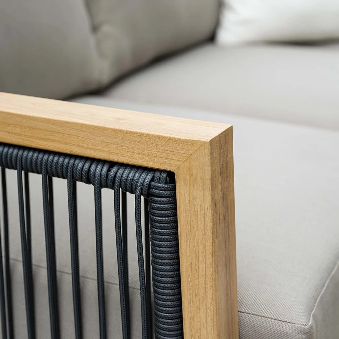 Für die Herstellung des Gestells wird hochwertiges und wetterfestes Aluminium verwendet. Farblich ist es in attraktivem Teaklook gehalten. Hochwertiges Rope umgibt das robuste Gestell und verleiht der Dininglounge damit einen ganz besonderen Look.