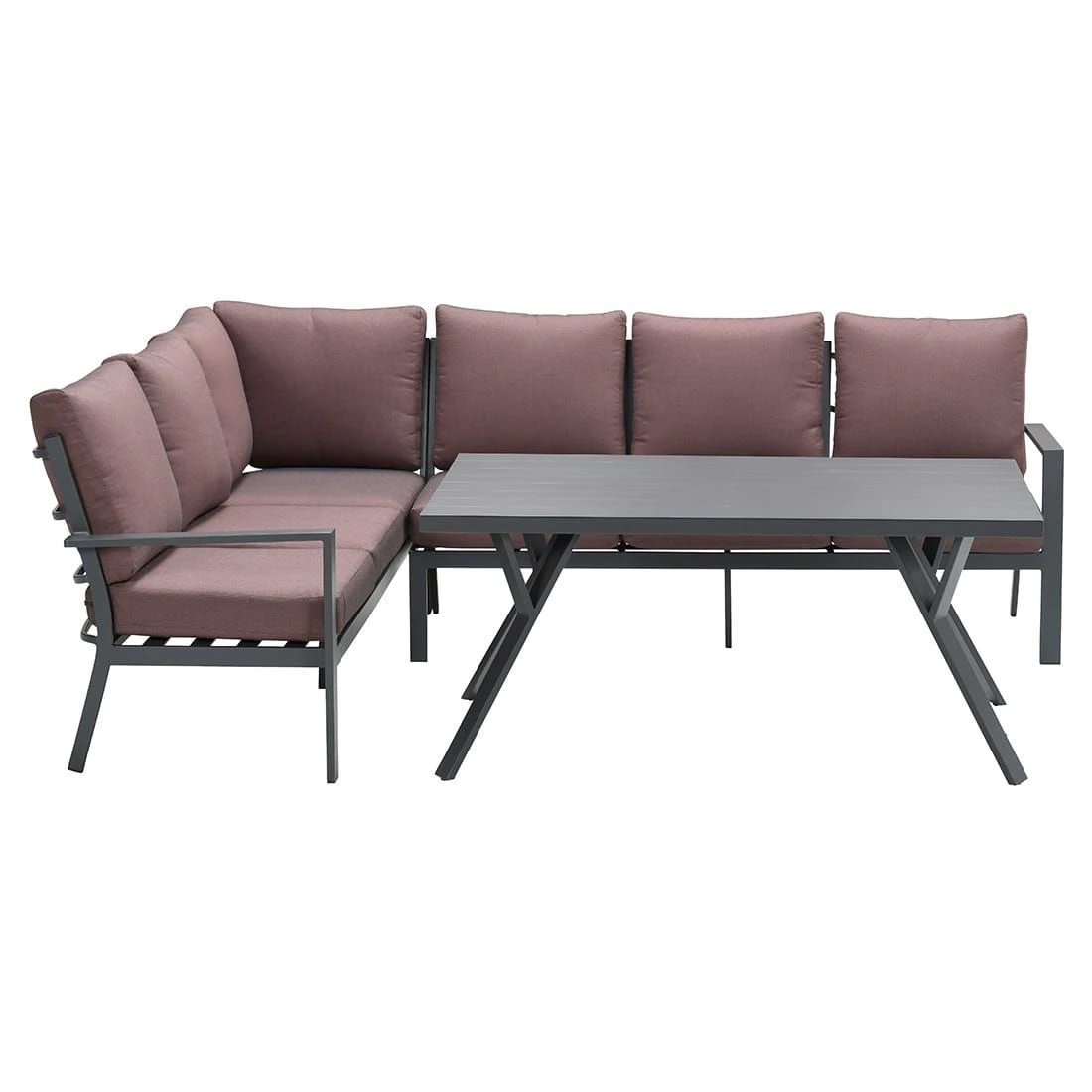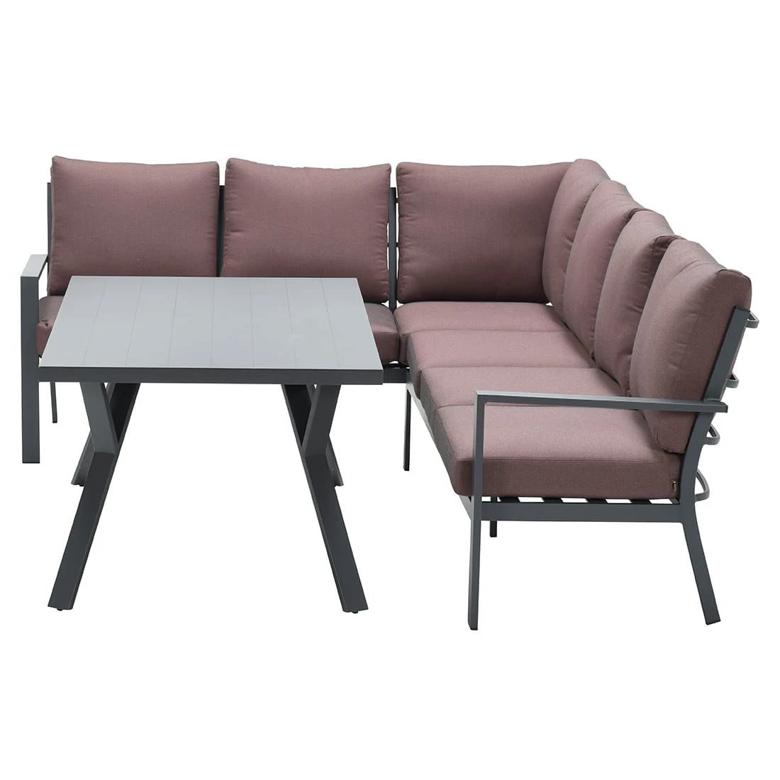 Der Bezug der Dininglounge ist aus Polyester gefertigt. Auch wenn diese Wind und Wetter trotzen, empfehlen wir die abnehmbaren Kissen bei länger andauernder Feuchtigkeit drinnen zu lagern.