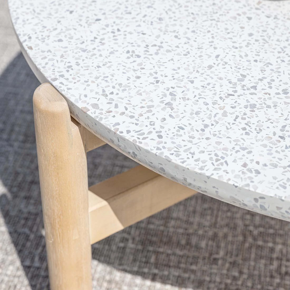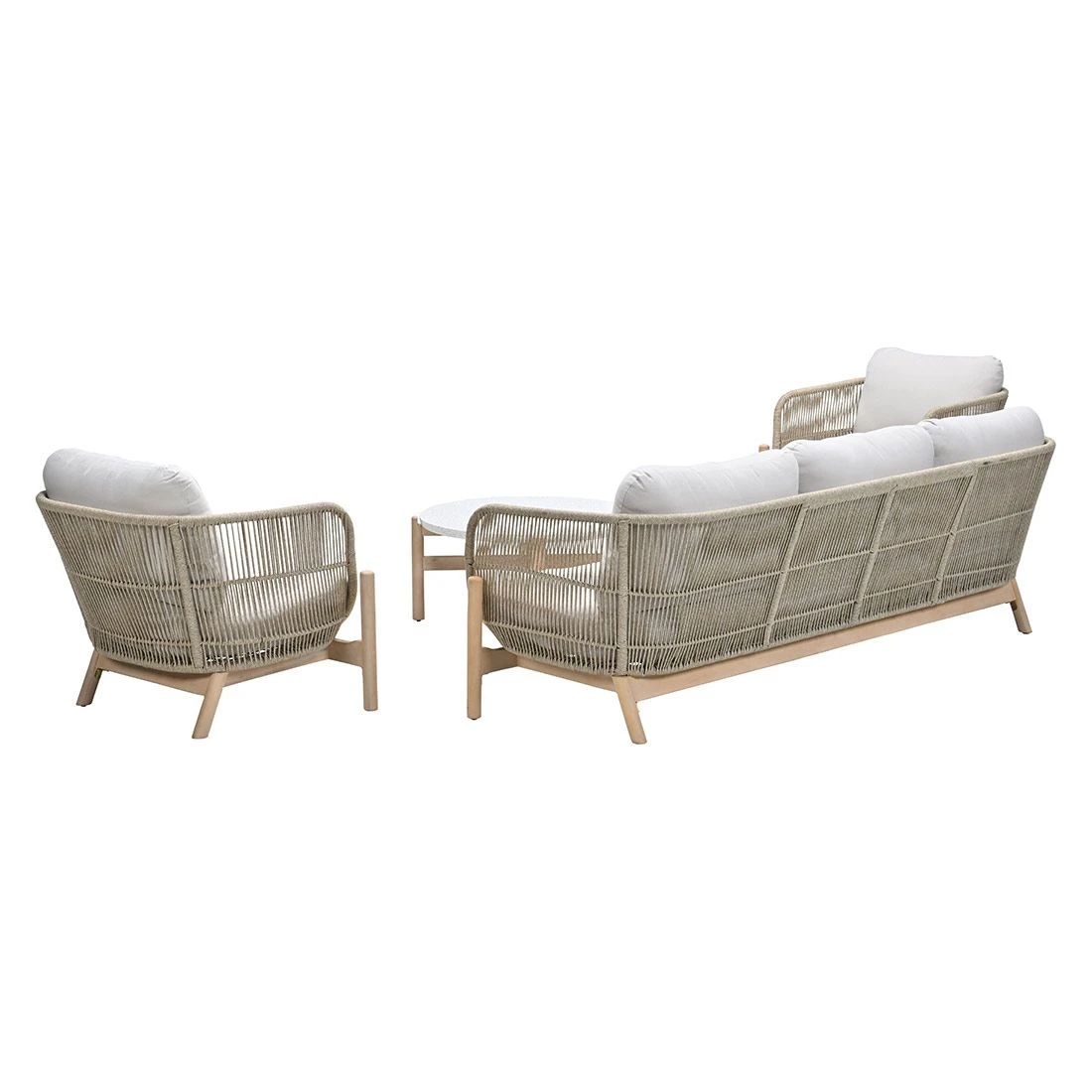Allen Holzliebhabern wird gefallen, dass das Gestell des Loungesets aus hochwertigem Akazienholz gefertigt wird. Optisch begeistert das Gestell in der Farbe Akazie White Wash. Das Gestell ist mit Rope umflochten und bringt somit ein gemütliches Flair auf Ihre Terrasse. Der Korpus ist farblich in geschmackvollem Beige gestaltet. Der Bezug des Loungesets ist aus Polyester gefertigt. Für eine längere Haltbarkeit empfehlen wir bei stärkerem oder lang anhaltendem Regen, die abnehmbaren Kissen im Innenraum zu lagern. Die Farbe des Bezugs ist Sand. Die Tischplatte ist aus Polystone gefertigt und dadurch für den Einsatz auf der Terrasse, im Garten und auf dem Balkon geeignet. Passend zum Gesamtbild des Loungesets begeistert die Tischplatte mit ihrer Farbgebung in Weiß-Grau Meliert.