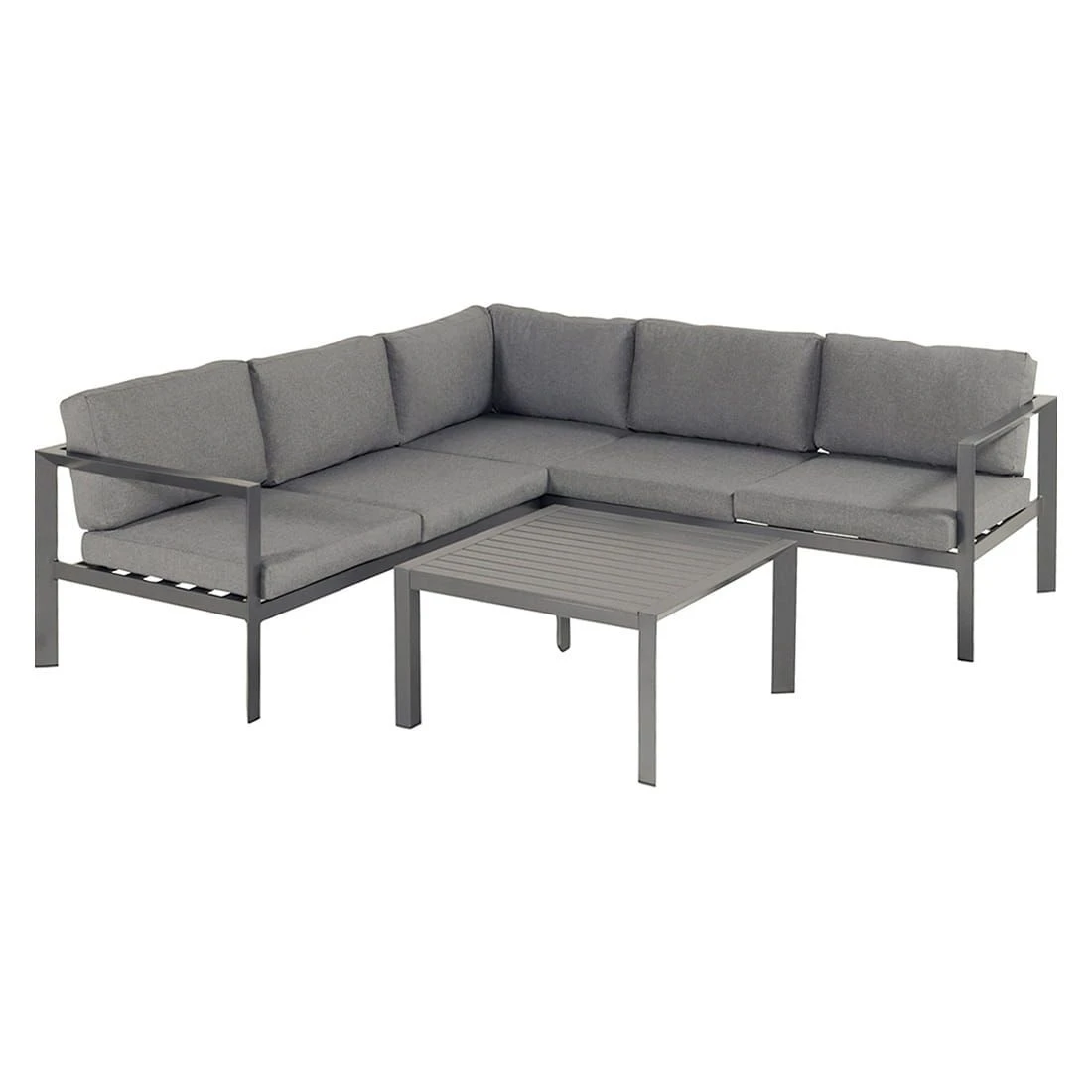Für das Gestell, die Sitzfläche und die Tischplatte kommt Aluminium zum Einsatz. Damit die Ecklounge optisch ansprechend ist, sind das Gestell und die Tischplatte im Farbton Dunkelgrau gehalten. Die Bezüge sind aus dem Marken-Outdoorstoff Olefin gefertigt. Das Material verbindet eine angenehme Stoffoberfläche mit hoher Witterungsbeständigkeit. Denn sowohl Sonne als auch Regen können dem robusten Outdoor-Stoff kaum etwas anhaben. Die Farbe des Bezugs ist Ash Grey.