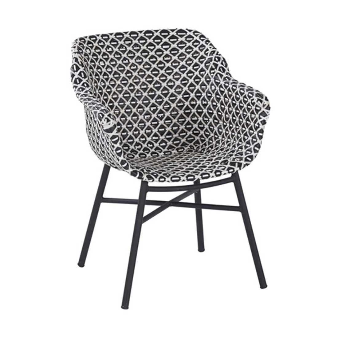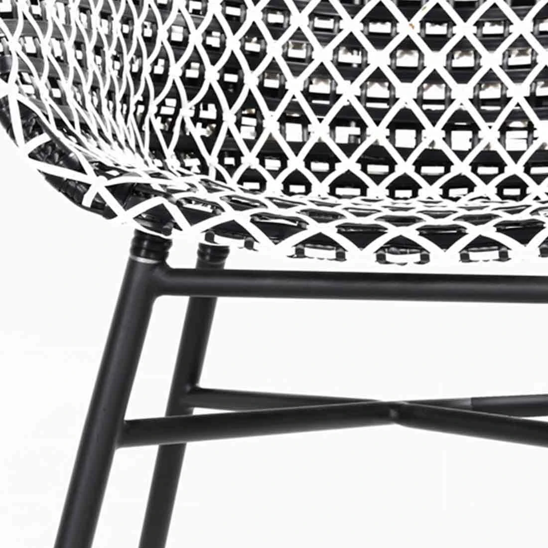 Der Korpus und die Sitzfläche sind aus Rope gefertigt. Für die Herstellung des Gestells wird hochwertiges und wetterfestes Aluminium verwendet. Für eine attraktive Optik ist das Gestell im Farbton Schwarz gehalten. Die Farbgestaltung der Sitzfläche in Schwarz-Weiß ist äußerst ansprechend.