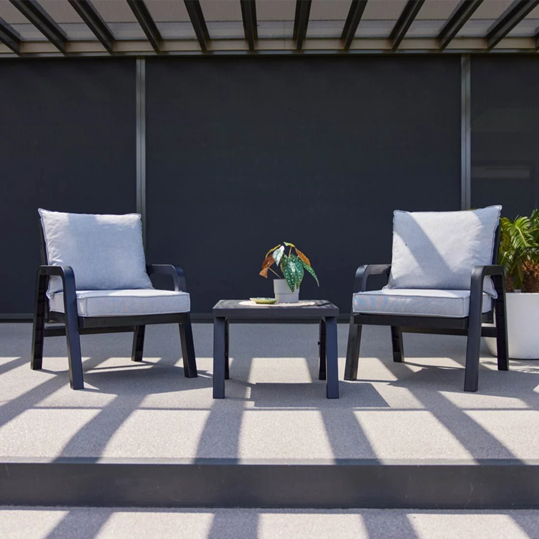 Für die Bezüge wird Olefin verwendet. Der Marken-Outdoorstoff überzeugt mit einer hohen Witterungsbeständigkeit. Denn sowohl Sonne als auch Regen können dem robusten Outdoor-Stoff kaum etwas anhaben. Sowohl die Gestelle als auch die Tischplatte werden aus Kunststoff gefertigt. Somit gibt das Gartenmöbel-Set ein einheitliches Bild auf Ihrer Terrasse ab.
