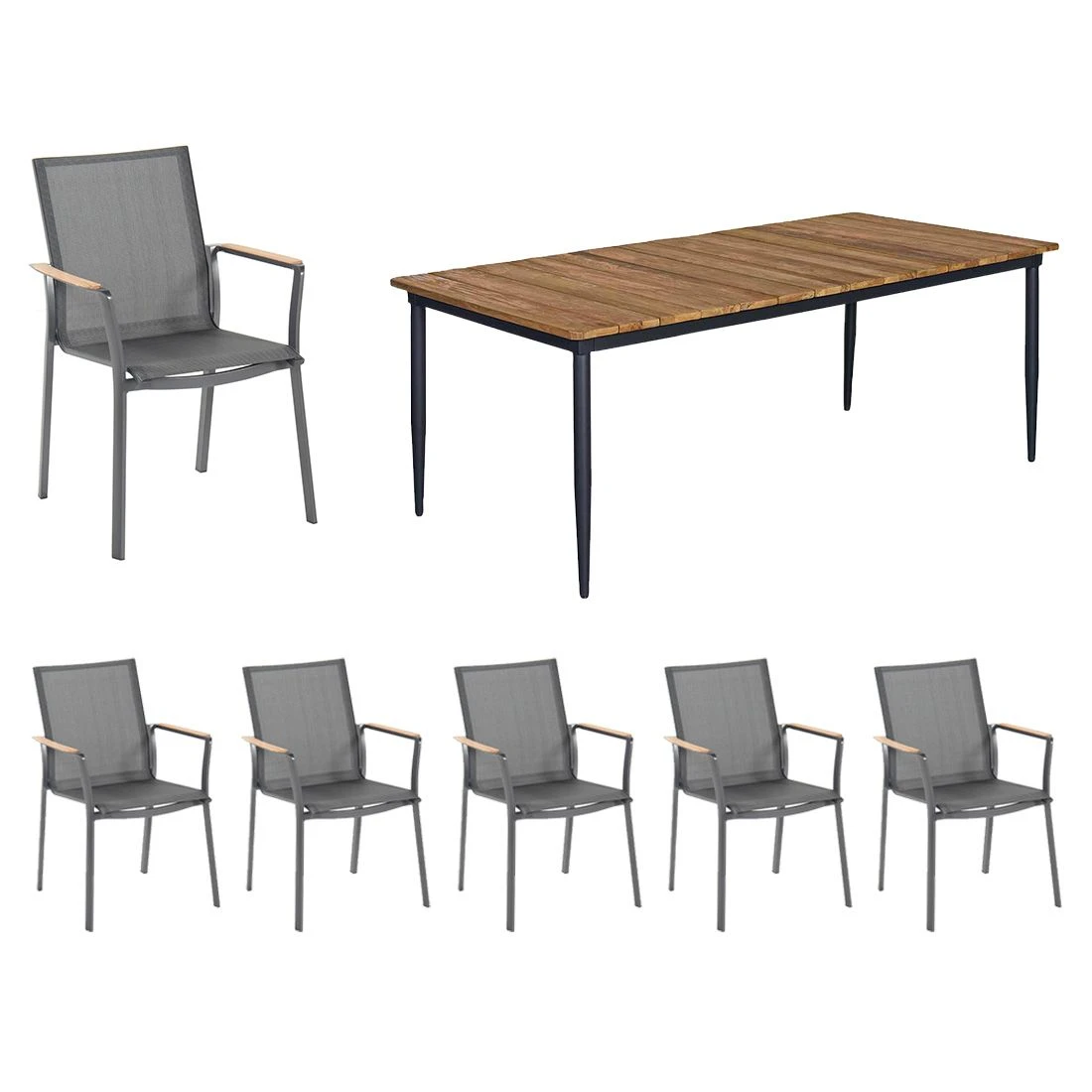Zum Lieferumfang des Sets gehört auch ein passender Tisch. Als Material für die Tischplatte wird das edle Hartholz Teak gewählt. Die Maserung des Holzes und der gemütliche Farbton integrieren sich sehr angemessen in das Gesamtbild eines jeden Gartens und sorgen für eine einzigartige natürliche Atmosphäre. Als klassische Design-Komponente fungiert das geradlinige Vierfußgestell. Der Tisch ist klassisch rechteckig gestaltet.
