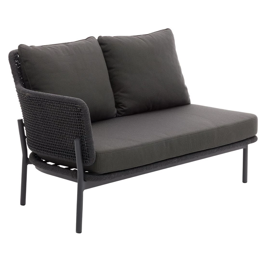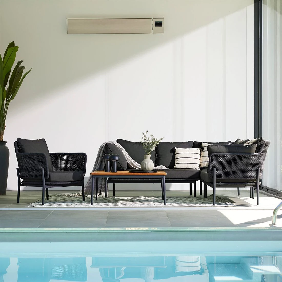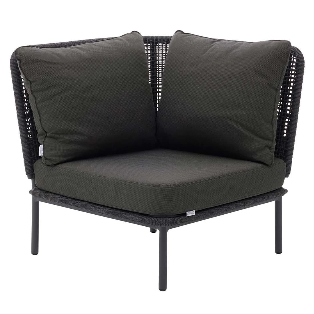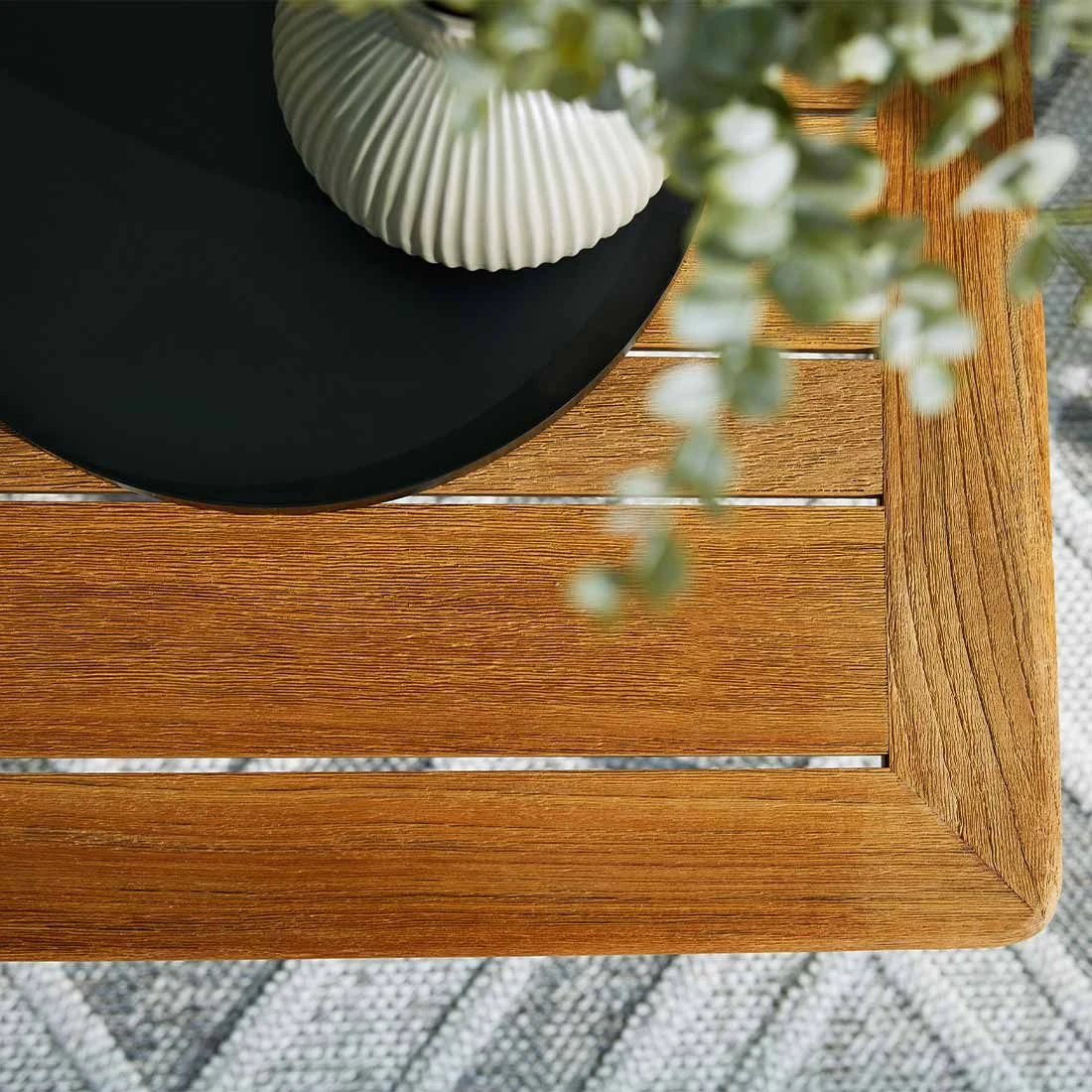 Als Material des Gestells hat der Hersteller qualitativ hochwertiges Aluminium gewählt. Optisch begeistert das Gestell in der Farbe Anthrazit. Die Sitzfläche ist mit Rope bespannt. Dieses Material ist wetterfest. Die Bezüge sind aus dem Marken-Outdoorstoff Olefin gefertigt. Das Material verbindet eine angenehme Stoffoberfläche mit hoher Witterungsbeständigkeit. Denn sowohl Sonne als auch Regen können dem robusten Outdoor-Stoff kaum etwas anhaben. Die Farbe des Bezugs ist Dunkelgrau. Die Tischplatte ist aus natürlichem Teak gefertigt. Durch den sehr hohen natürlichen Ölanteil ist sie bereits von Haus aus perfekt vor Witterungseinflüssen geschützt. Farblich überzeugt die Tischplatte in Natur.