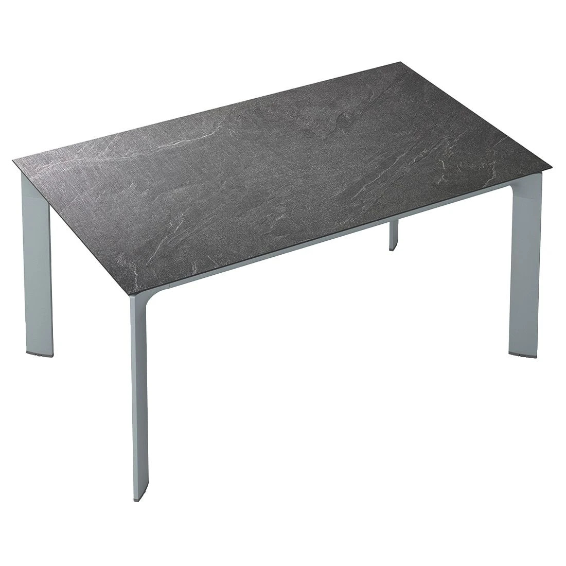 Als Gestellmaterial dient hochwertiges Aluminium. Klassisch aus vier Tischbeinen besteht das Gestell des Tisches. Die geschmackvolle HPL-Tischplatte ist nicht nur ein optischer Hingucker, sondern besitzt zudem eine sehr widerstandsfähige und unbedingt kratzfeste Oberfläche, die unterschiedlichen Belastungen trotzt. Farblich ist die Tischplatte in einem schönen Jura Anthrazit gehalten. Die rechteckige Form ermöglicht es Ihnen, den Gartentisch in Ecken und an Häuserwänden platzsparend einzusetzen.
