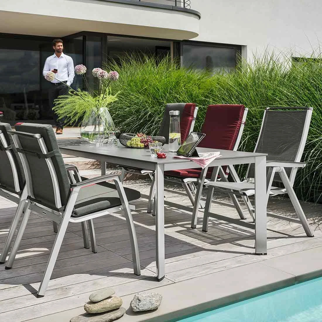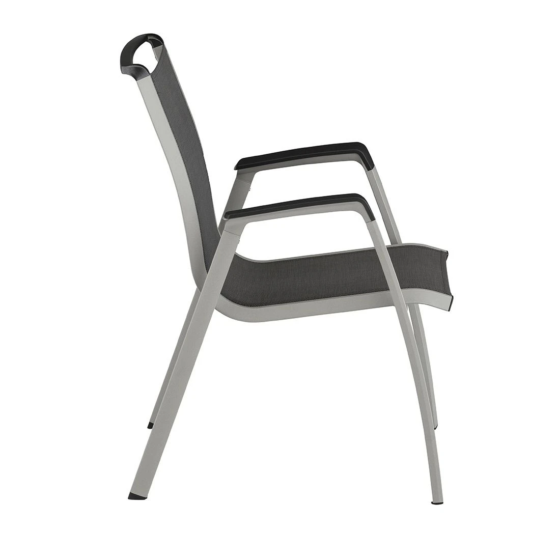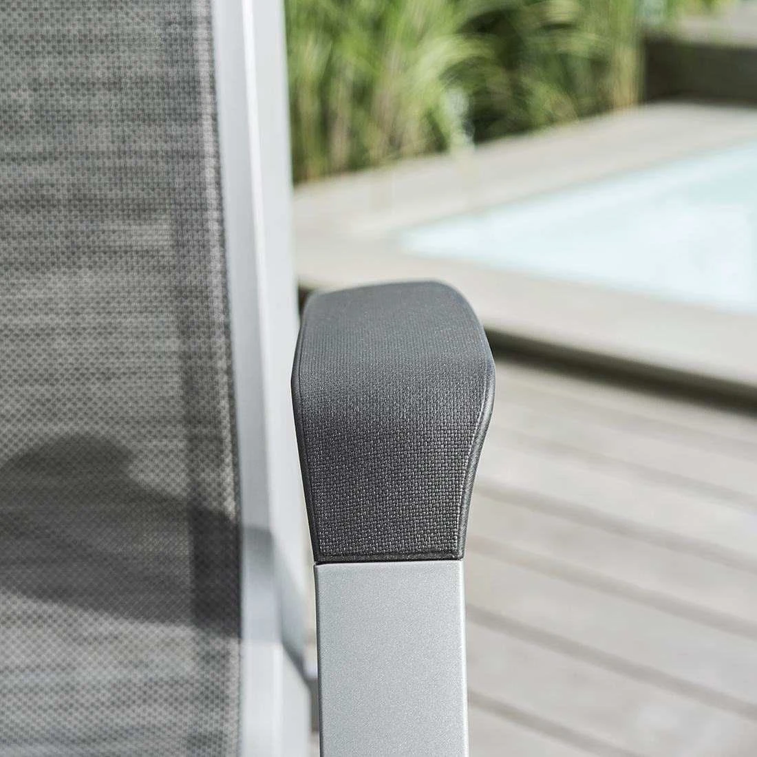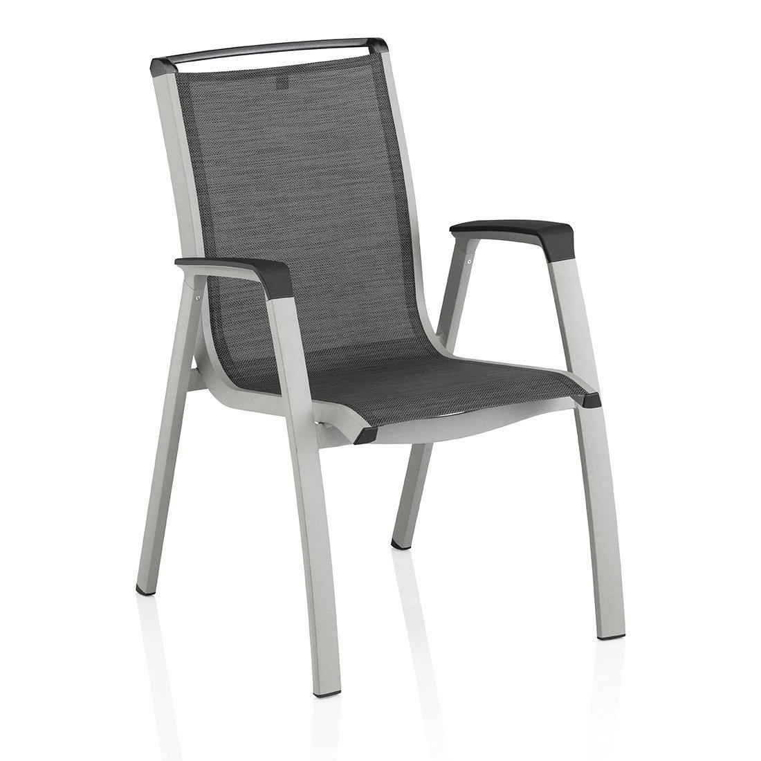 Das Gestell wird aus Aluminium gefertigt. Das geringe Eigengewicht des Materials macht den Stapelsessel zu einem robusten, aber dennoch leicht zu transportierenden Sitzmöbel auf Ihrer Terrasse. Farblich ist dieses in Silber gehalten. Ein weiterer Pluspunkt des Stapelsessels ist die Bespannung mit Textilene. Dieser Bezugsstoff überzeugt durch eine hohe Robustheit gegenüber Hitze und Frost und ist leicht zu reinigen. Die Farbgestaltung der Sitzfläche in Graphit ist äußerst ansprechend.