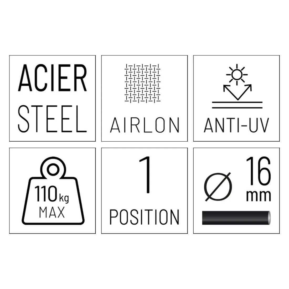Das Gestell ist aus Stahl (Farbe: Titane) gefertigt und sorgt damit für stabilen Halt beim Sitzen. Für die Bespannung der Sitzfläche verlässt sich der Hersteller auf hochwertiges Airlon-Gewebe. Es zeichnet sich durch seine außergewöhnliche Festigkeit und seine UV- und Witterungsbeständigkeit aus. Das Gewebe besteht aus 100% Polyester und fühlt sich glatt und weich an. Das Gestell besticht mit seinen attraktiven Kufen. Die Klappbarkeit ermöglicht es, den Gartenstuhl bei Nicht-Benutzung oder im Winter kompakt einzulagern. Angenehm ist auch die Sitzhöhe, welche bei 30 cm liegt.