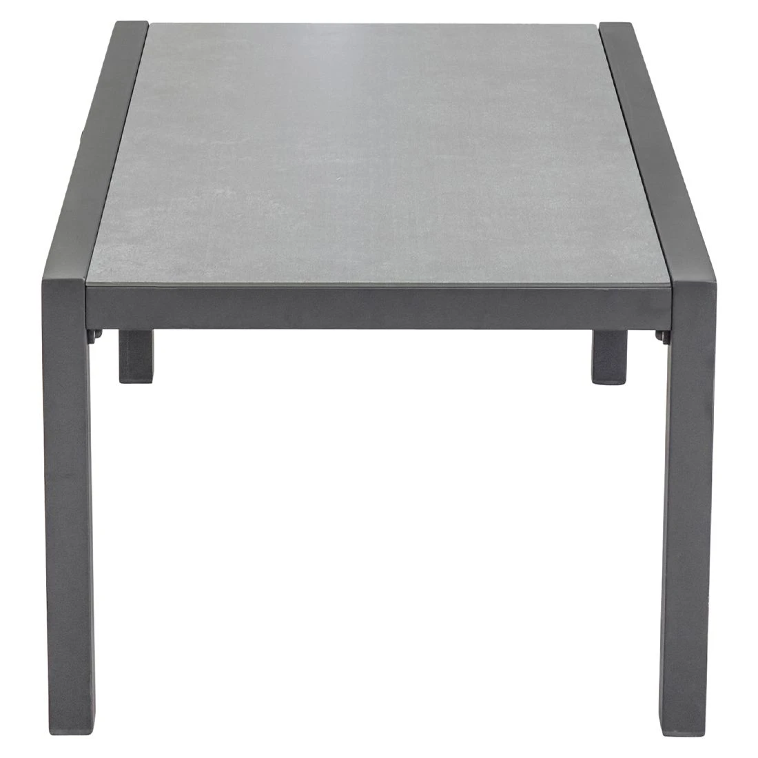 Als Material für die Tischplatte wurde Keramik gewählt. Das robuste Material ist leichter wie Naturstein, aber ebenso robust und stabil. Gefertigt ist das Gestell aus Aluminium. Das macht es leicht, aber dennoch stabil. Während die Farbe des Gestells Anthrazit ist, begeistert die Tischplatte in Steingrau.