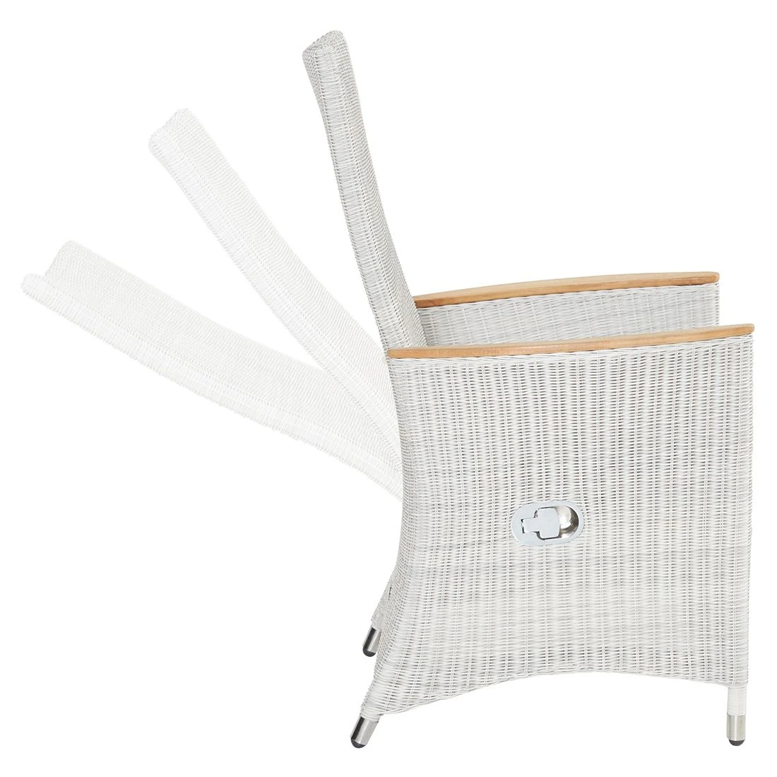 Die robusten Metallgestelle aus Aluminium sind pflegeleicht und garantieren gleichzeitig eine hohe Stabilität. Darüber hinaus gewährleistet dieses leichte Material, dass Sie die Möbel bequem transportieren können. Das stabile Untergestell ist von einem hochwertigen Geflecht aus Polyrattan umwoben. Farblich begeistern die Bezüge in elegantem Dunkelgrau. Im Set enthalten ist auch ein passender Tisch. Die Tischplatte ist aus qualitativ hochwertigem Teak hergestellt. Durch den sehr hohen natürlichen Ölanteil, ist sie damit sehr gut vor Witterungseinflüssen geschützt. Das Design des Tisches ist klassisch rechteckig gehalten. Als klassische Design-Komponente fungiert das geradlinige Vierfußgestell.