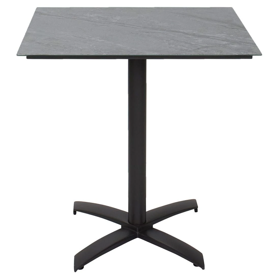 Das Gestell des attraktiven Tisches ist aus Aluminium gefertigt. Ein stabiler Unterbau und dabei gleichzeitig dekorativ ist das Säulengestell. Die Tischplatte ist aus wertigem Keramik-Glas gefertigt. Im Gegensatz zu vielen anderen Tischplattenmaterialien sind solche Platten äußerst kälte- und hitzebeständig und zählen somit zu den robustesten Tischplatten auf dem Markt. Farblich ist die Tischplatte in einem schönen Steingrau gehalten. Die Form des Klapptisches ist kompakt gehalten.