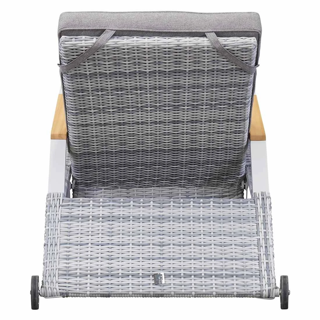Für die Herstellung des Gestells wird hochwertiges und wetterfestes Aluminium verwendet. Farblich ist dieses in Off white gehalten. Das elegante Polyrattan-Geflecht rundet das Gesamtbild stilvoll ab. Der Bezug besteht aus einem strapazierfähigen Kunstfaser-Stoff. Er ist widerstandsfähig und bietet somit die idealen Voraussetzungen für den Einsatz im Freien. Den finalen Schliff erhält diese Gartenliege durch den Bezug in Grau.