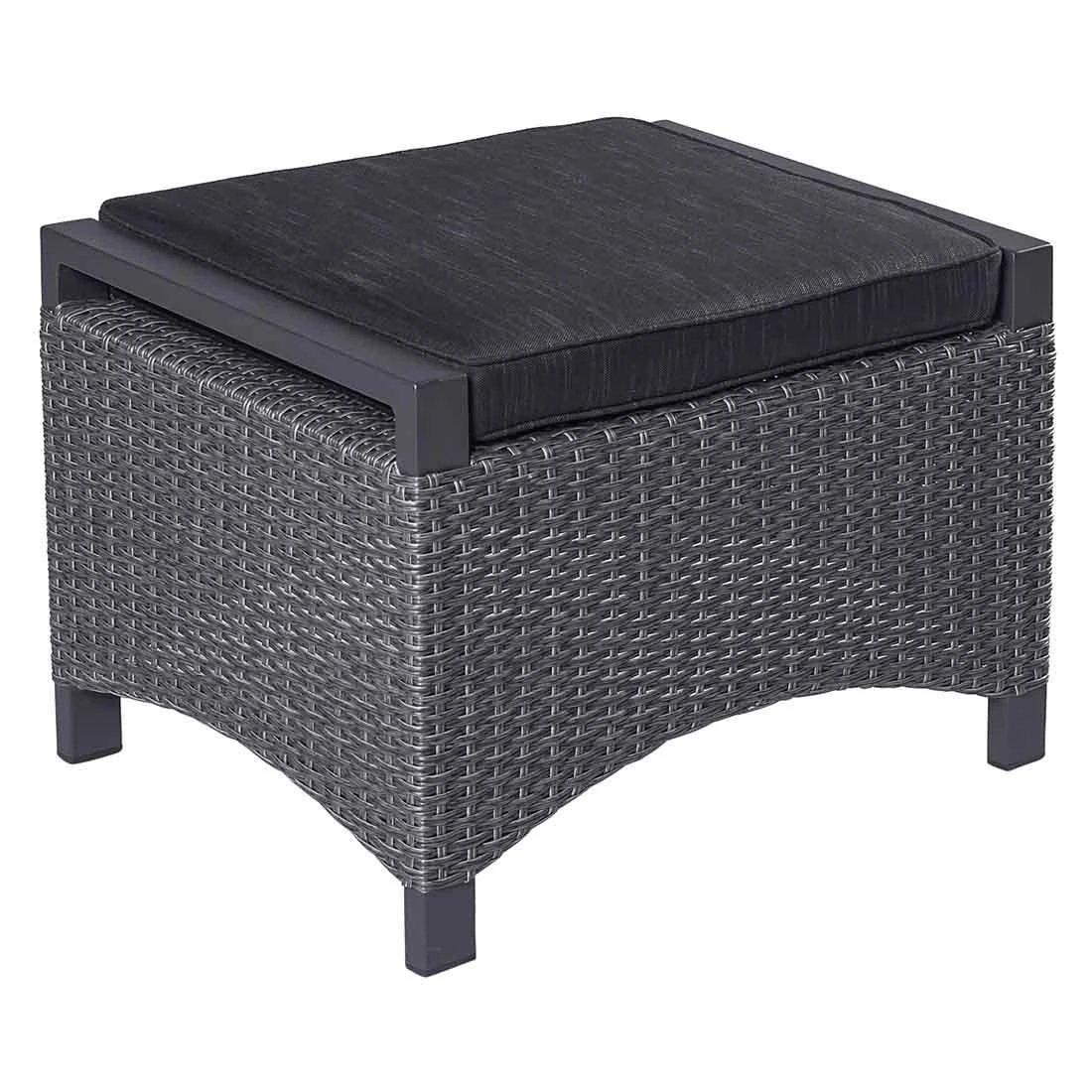 Für die Herstellung des Gestells wird hochwertiges und wetterfestes Aluminium verwendet. Farblich ist dieses in Anthrazit gehalten. Ein hochwertiges Polyrattan-Geflecht umgibt das robuste Gestell und verleiht dem Gartenhocker damit einen ganz besonderen Look.