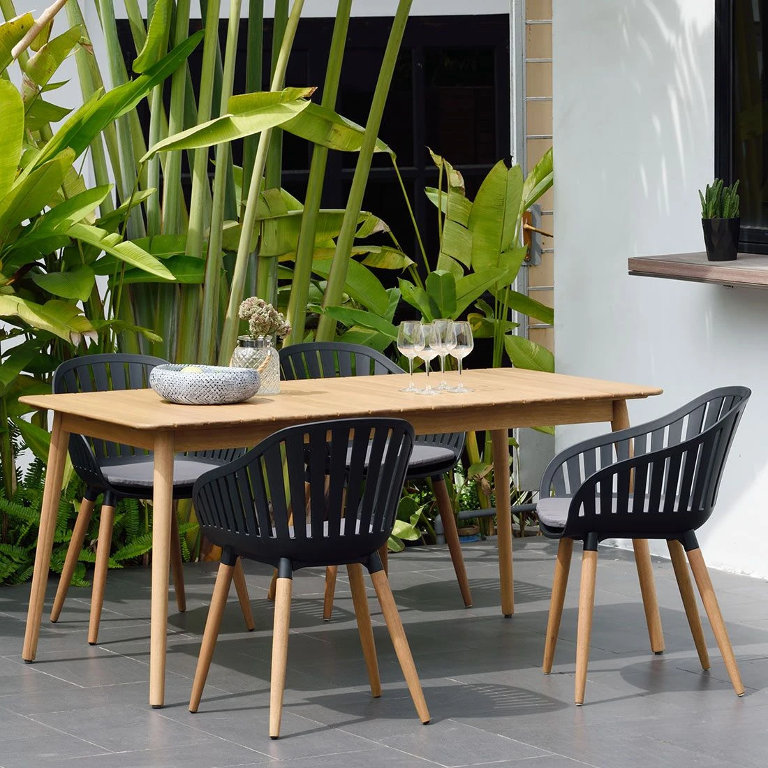 Das Gestell wird aus Eukalyptusholz gefertigt und bringt ein natürliches Flair auf Ihre Terrasse. Für eine attraktive Optik ist das Gestell im Farbton Teak-Look gehalten. Die Sitzfläche besteht aus praktischem Kunststoff. Die Farbgestaltung der Sitzfläche in Schwarz ist überaus ansprechend.