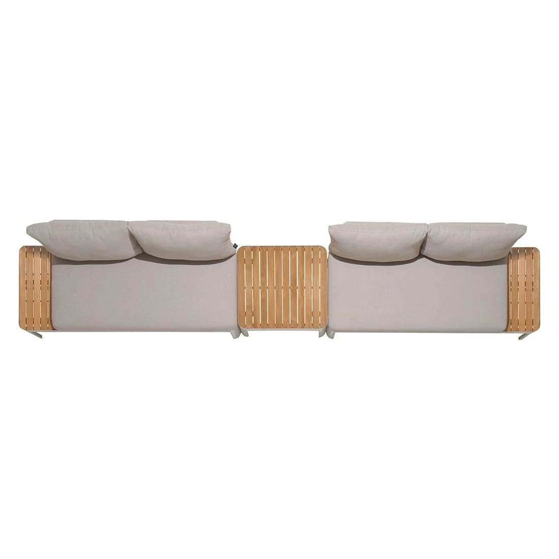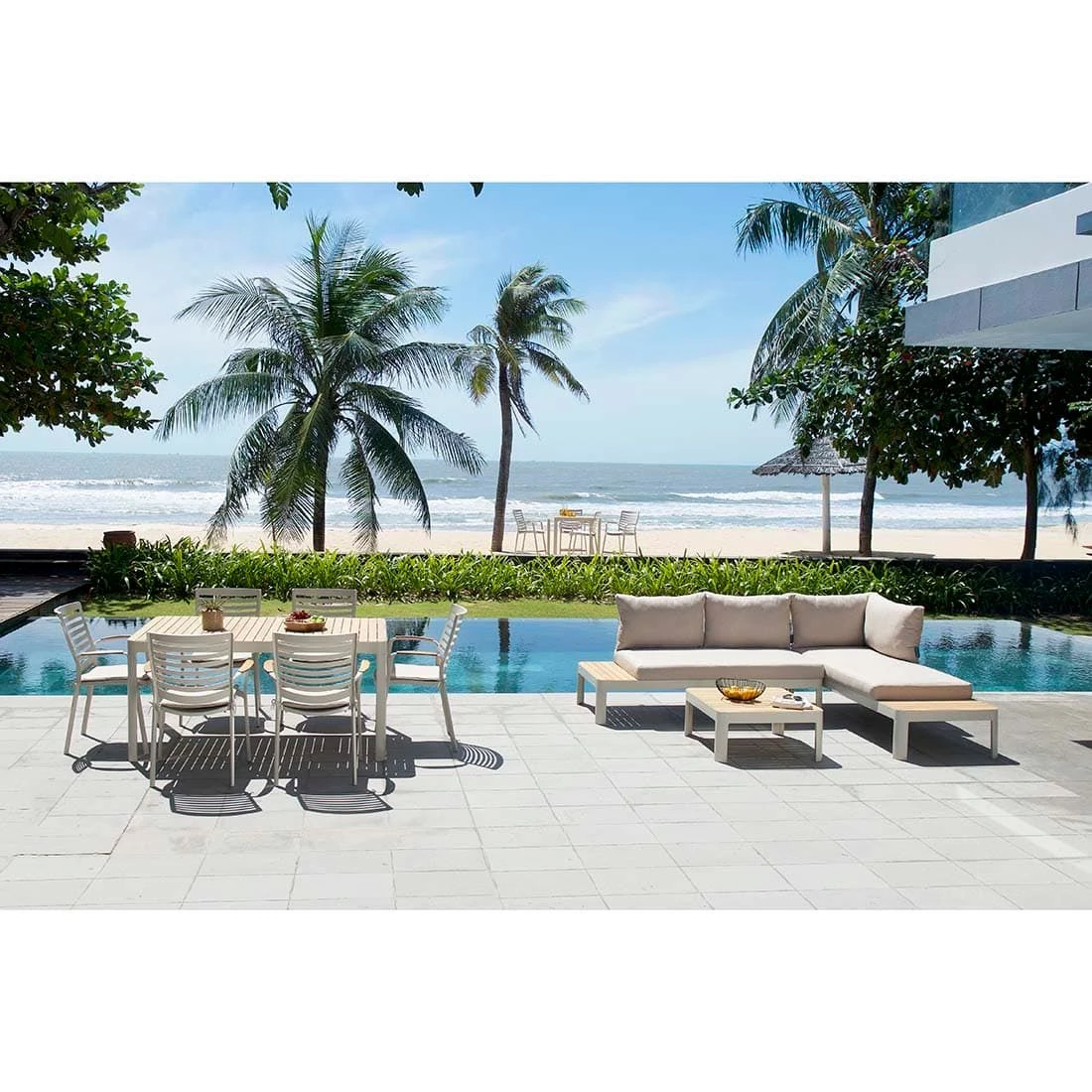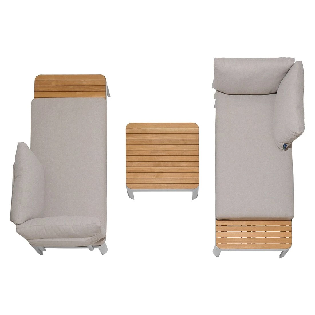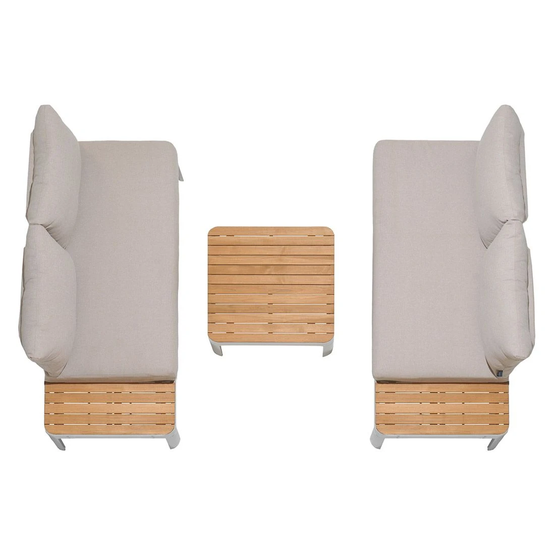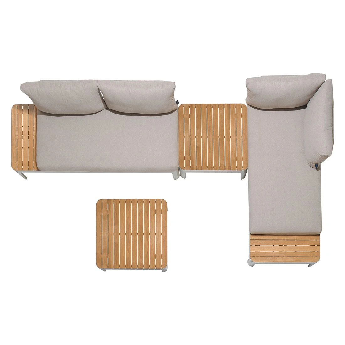 Für die Sitzfläche und die Tischplatte kommt Teakholz zum Einsatz. Damit die Ecklounge optisch ansprechend ist, sind die Tischplatte und die Sitzfläche im Farbton Teak gehalten. Als Gestellmaterial hat der Hersteller wertiges Aluminium gewählt. Optisch begeistert das Gestell in der Farbe Korallensand. Die Bezüge sind aus dem Marken-Outdoorstoff Olefin gefertigt. Das Material verbindet eine angenehme Stoffoberfläche mit hoher Witterungsbeständigkeit. Denn sowohl Sonne als auch Regen können dem robusten Outdoor-Stoff kaum etwas anhaben. Die Farbe des Bezugs ist Beige.