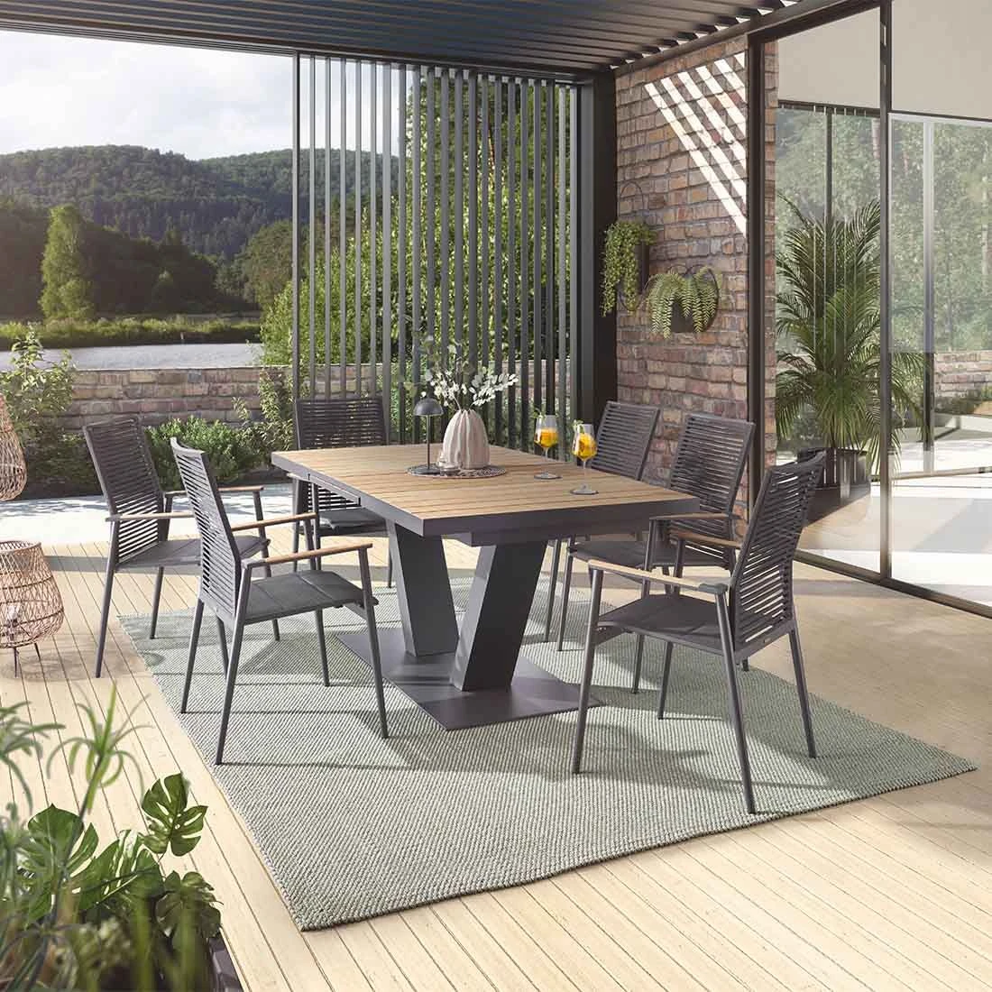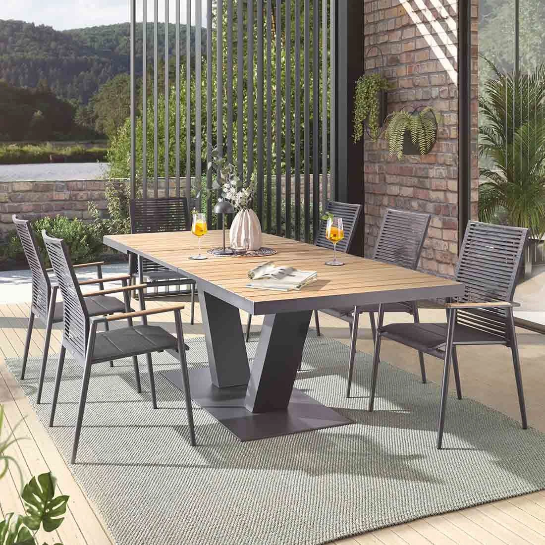 Als Material des Gestells dient qualitativ hochwertiges Aluminium. Den finalen Schliff erhält das Gestell durch seine attraktive Säulenform. Diese ist nicht nur ein absoluter Blickfang, sondern ermöglicht auch rundherum viel Beinfreiheit. Teakholz ist außerordentlich widerstandsfähig gegen Witterungseinflüsse wie Schwankungen der Temperatur, Nässe und Trockenheit. Kein Wunder, dass für den Ausziehtisch Den Haag dieses hochwertige Hartholz als Material für die Tischplatte ausgewählt wurde. Farblich ist die Tischplatte in einem schönen Natur gehalten. Der Ausziehtisch ist klassisch rechteckig gestaltet.