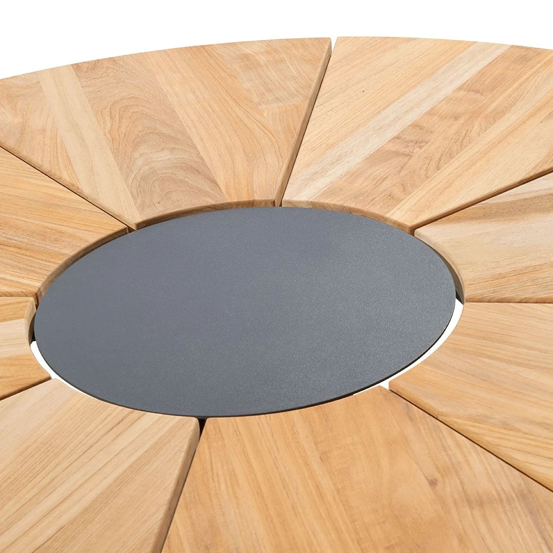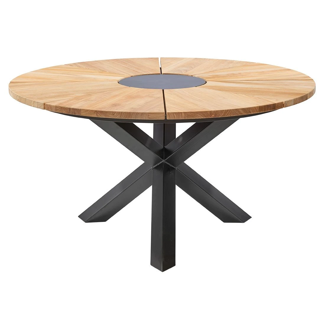 Als Material des Gestells dient hochwertiges und leichtes Aluminium. Komplettiert wird das Gesamtbild durch das moderne und außergewöhnliche Tischgestell in X-Form (sogenannten Cross Legs). Als Material für die Tischplatte wird das hochwertige Hartholz Teak verwendet. Die Maserung des Holzes und der helle Farbton integrieren sich sehr schön in jegliche Arten der Garten- und Balkongestaltung und sorgen für eine besonders natürliche Atmosphäre. Farblich ist die Platte in Teak gehalten. Der Gartentisch ist in seiner Form klassisch rund gefertigt.