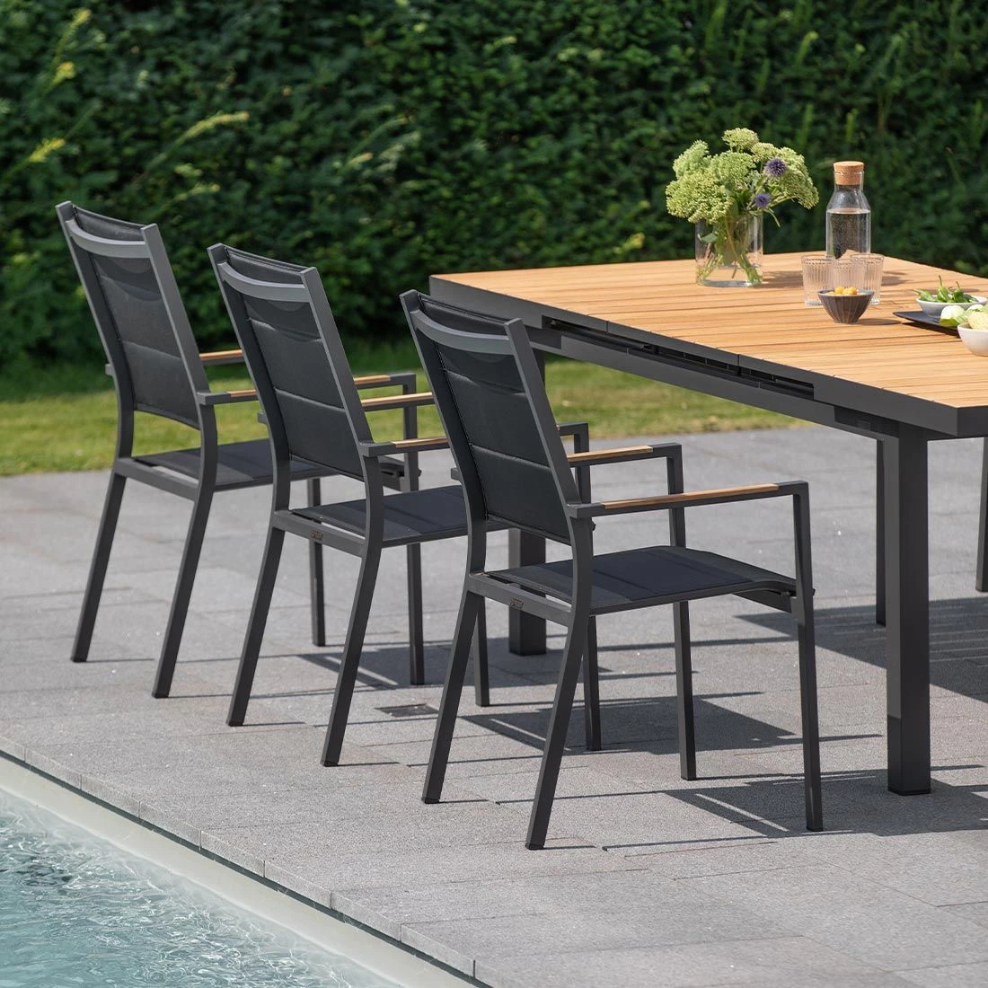 Das Gestell wird aus Aluminium in der Farbe Anthrazit gefertigt. Das geringe Eigengewicht des Materials macht den Stapelstuhl zu einem robusten, aber dennoch leicht zu transportierenden Sitzmöbel auf Ihrer Terrasse.