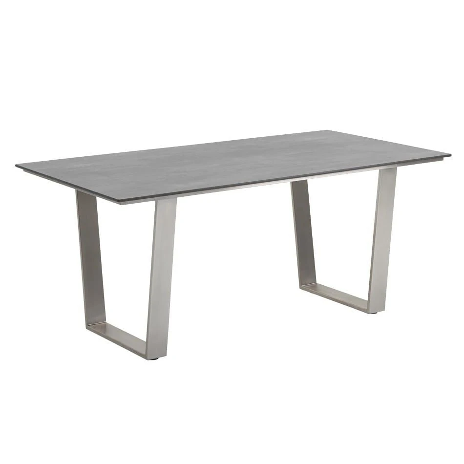 Als Gestellmaterial wird stabiler und rostfreier Edelstahl verarbeitet. Farblich ist das Gestell in Silber gehalten. Die edle HPL-Tischplatte ist nicht nur ein optischer Hingucker, sondern besitzt auch eine sehr widerstandsfähige und absolut kratzfeste Oberfläche, die jeglichen Belastungen standhält. Für ein stimmiges Gesamtbild erscheint die Platte in der Farbe Grau. Der moderne Look des Gartentisches wird durch die attraktiven Kufen nochmals betont. Die rechteckige Form ermöglicht es Ihnen, den Gartentisch in Ecken und an Häuserwänden platzsparend einzusetzen.