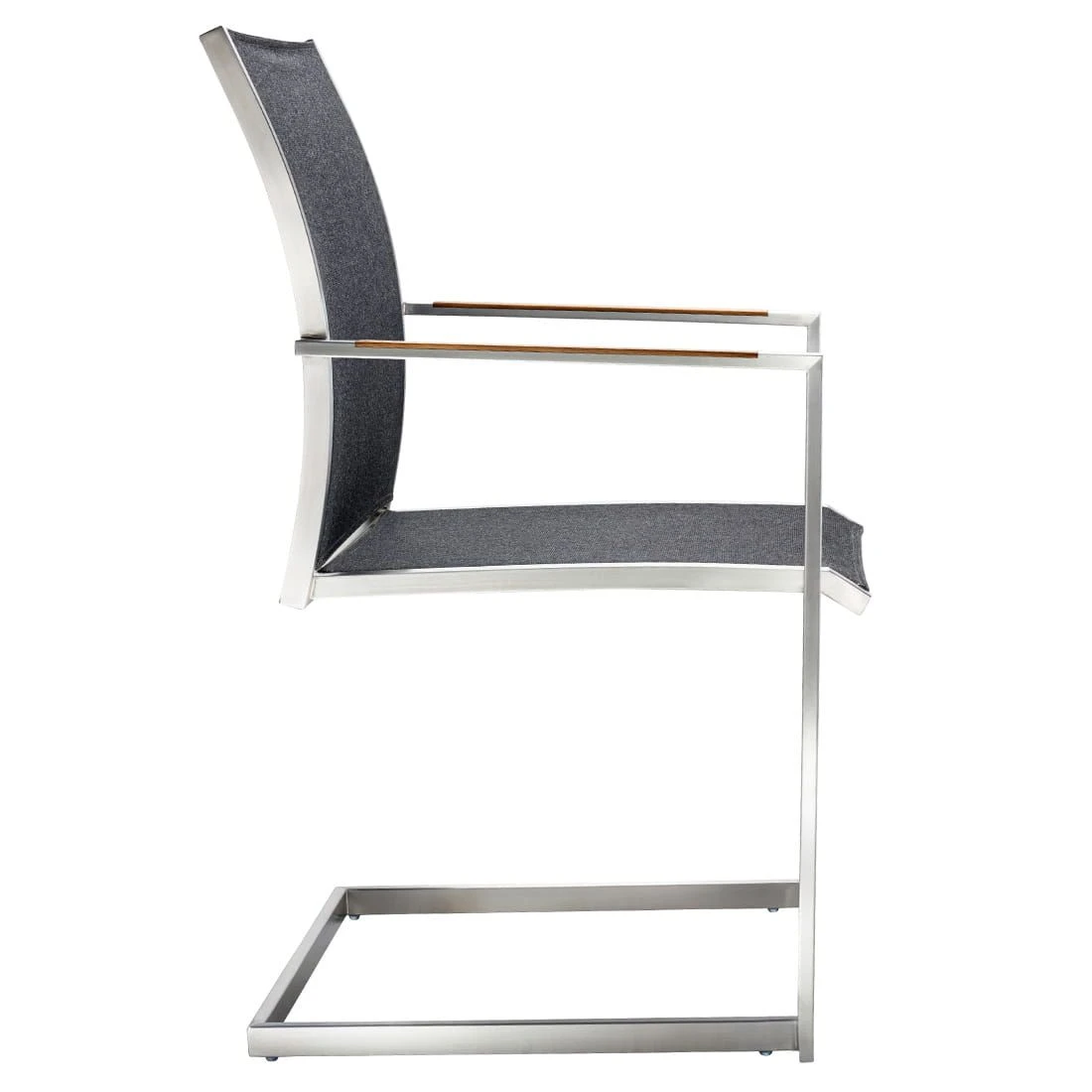 Das Gestell wird aus hochwertigem und rostfreiem Edelstahl hergestellt. Aufgrund des etwas höheren Eigengewichts, steht der Freischwinger dadurch besonders stabil und windsicher auf der Terrasse.