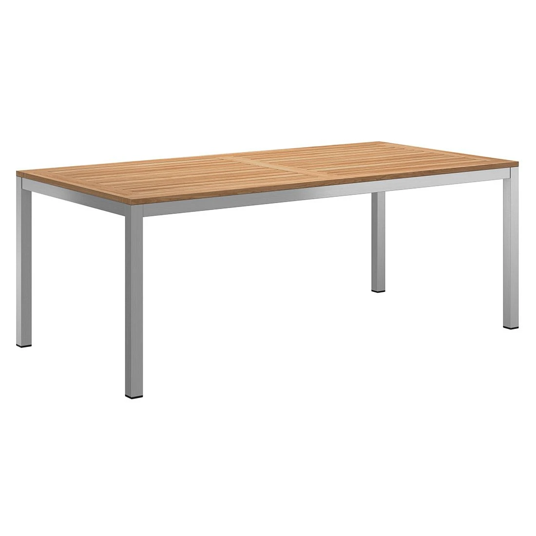 Im Preis des Sets ist ein passender Tisch enthalten. Teak ist extrem widerstandsfähig gegen Witterungseinflüsse wie Schwankungen in der Temperatur, Nässe und Trockenheit. Kein Wunder, dass dieses hochwertige Holz als Material für die Tischplatte verwendet wird. Als klassische Design-Komponente fungiert das geradlinige Vierfußgestell. Mit der rechteckigen Form lässt sich der Tisch platzsparend in Ecken oder an Häuserwänden aufstellen.