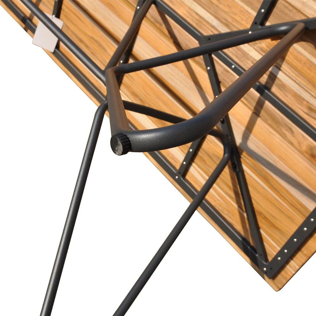 Für das Gestell wird robuster Stahl genutzt. Klassisch aus vier Tischbeinen besteht das Gestell des Tisches. Teakholz ist extrem widerstandsfähig gegen Witterungseinflüsse wie Temperaturschwankungen, Nässe und Trockenheit. Kein Wunder, dass für den Gartentisch Maranello dieses hochwertige Hartholz als Material für die Tischplatte ausgesucht wurde. Farblich ist die Platte in Teak gehalten. Das Design des Gartentisches ist klassisch rechteckig gestaltet.
