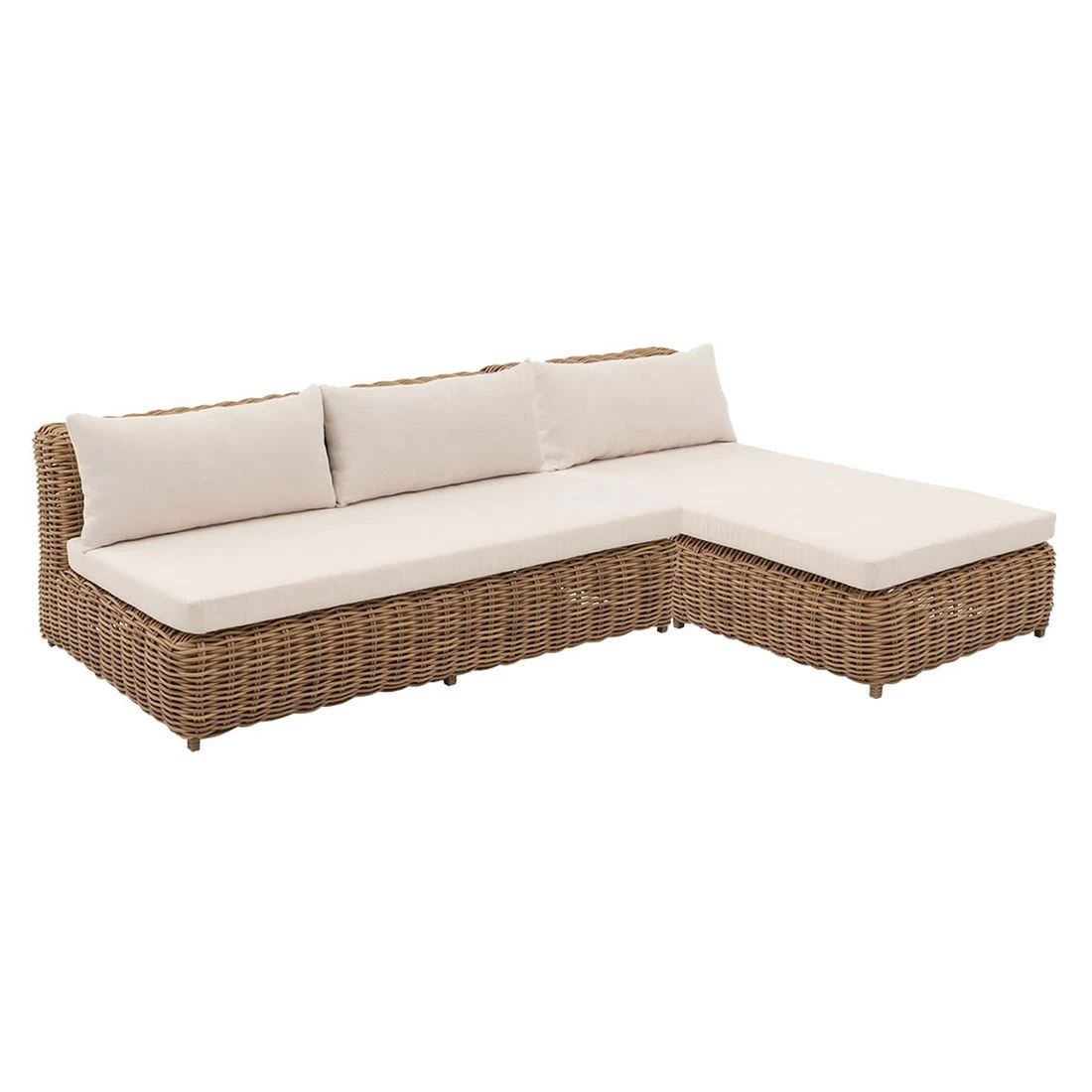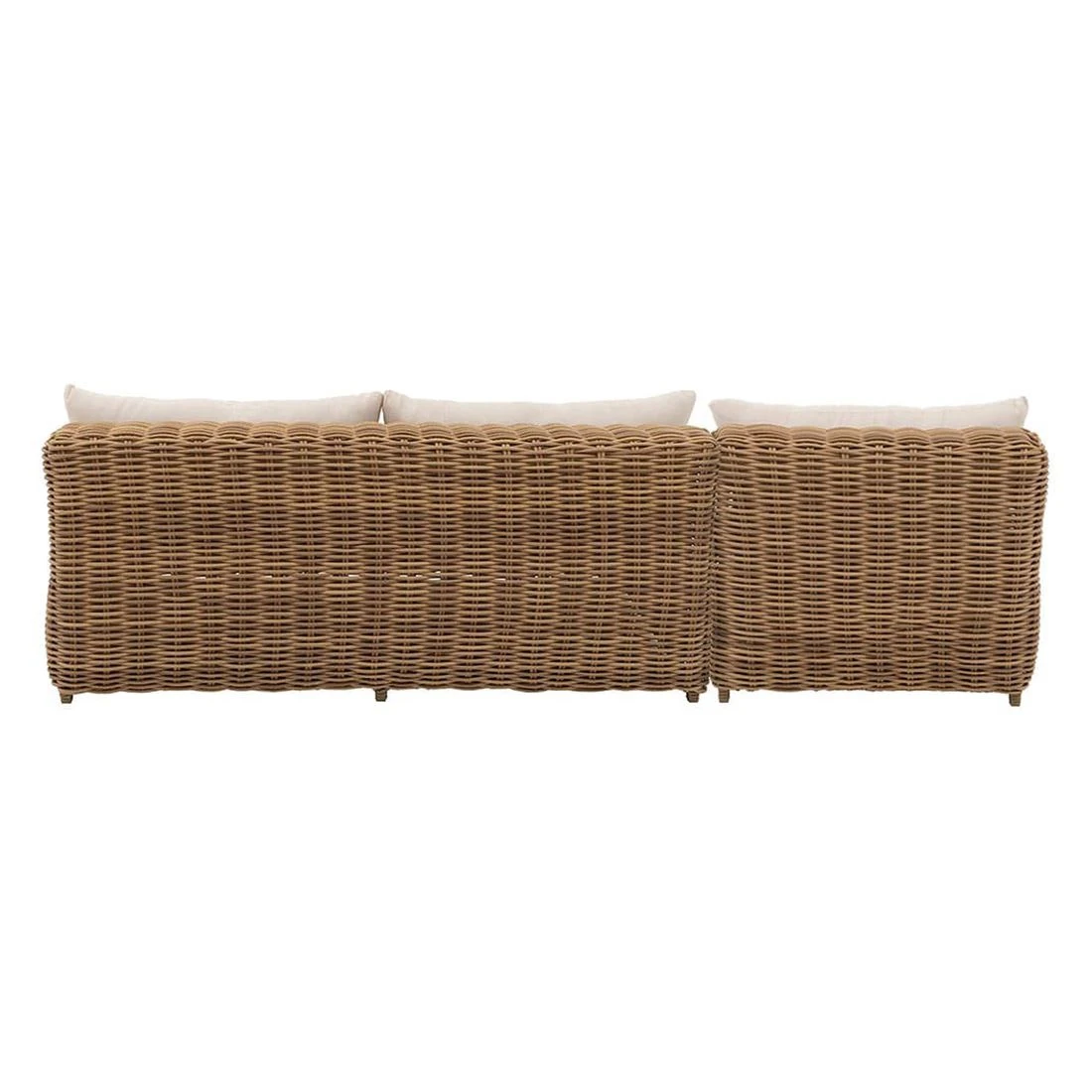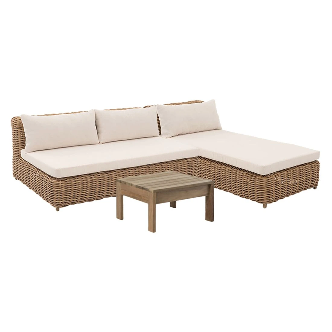 Damit die Ecklounge optisch ansprechend ist, sind die Tischplatte und die Sitzfläche im Farbton Natur gehalten. Als Material des Gestells hat der Hersteller wertiges Aluminium gewählt. Die Sitzfläche, die mit hochwertigem Polyrattan umflochten ist, bringt ein natürliches Ambiente auf Ihre Terrasse. Dieses Material zeichnet sich durch eine hohe Wetterbeständigkeit aus. Der Bezug der Ecklounge ist aus Polyester gefertigt. Auch wenn der Bezugsstoff Wind und Wetter trotzen kann, empfehlen wir, abnehmbare Kissen bei länger andauernder Feuchtigkeit und im Winter drinnen zu lagern. Die Farbe des Bezugs ist Mixed Beige. Die Platte des Tisches ist aus wertigem Teakholz hergestellt. Mit ihrem hohen natürlichen Anteil an Öl ist sie bereits von Haus aus gut vor Witterungseinflüssen geschützt.