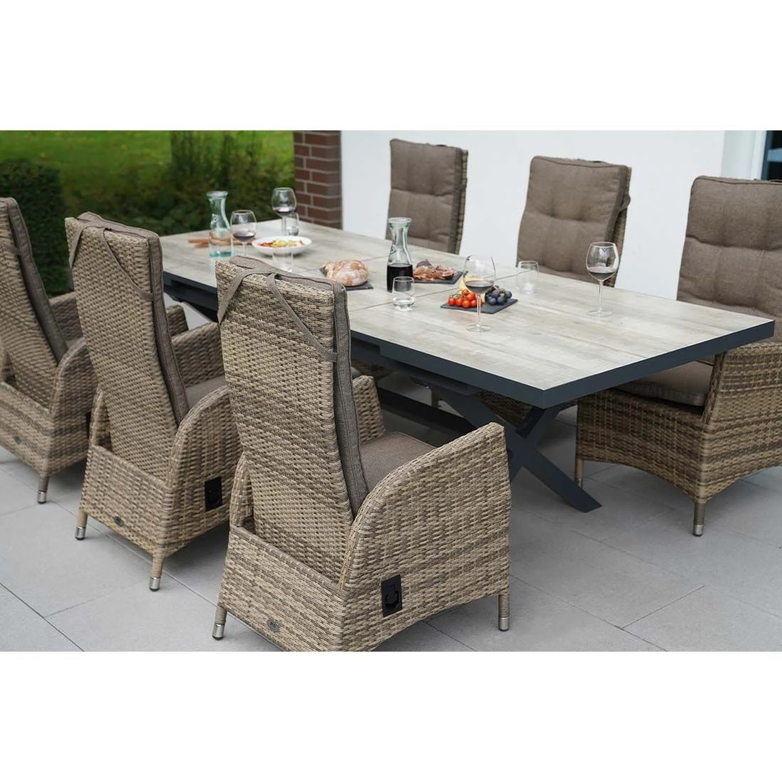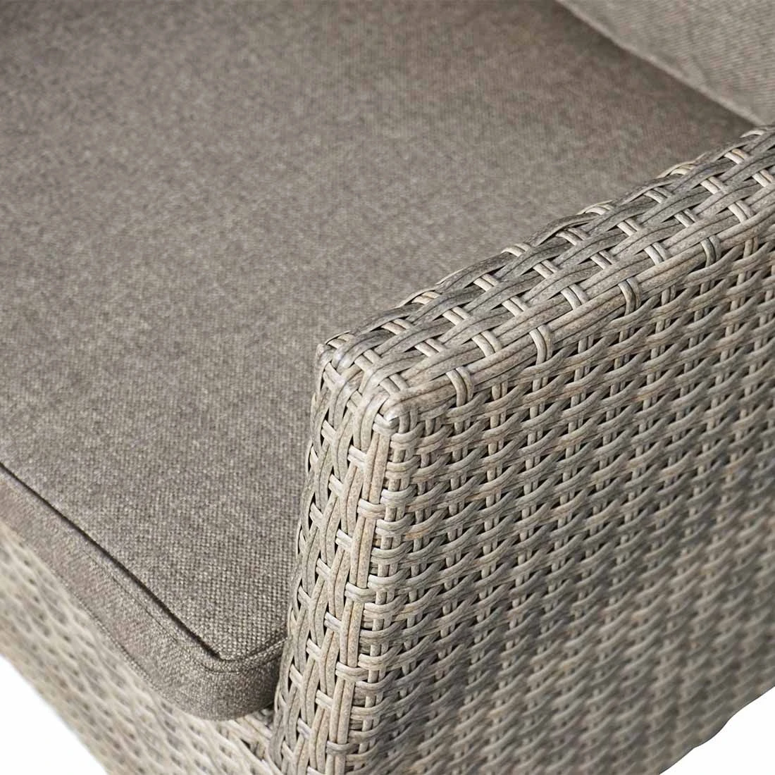Das Gestell besteht aus pflegeleichtem und wetterfestem Aluminium. Ein hochwertiges Polyrattan-Geflecht umgibt das robuste Gestell und verleiht dem Gartensessel damit einen ganz besonderen Look. Als hochwertiges Material für den Bezug kommt ein Polyester-Stoff zum Einsatz. Er ist sehr strapazierfähig und bietet somit die idealen Voraussetzungen für den Einsatz im Freien. Farblich begeistert der Bezug in elegantem Savanna. Für ein perfekt stimmiges Gesamtbild sorgt die einheitliche Farbgebung in stilvollem Savanna.
