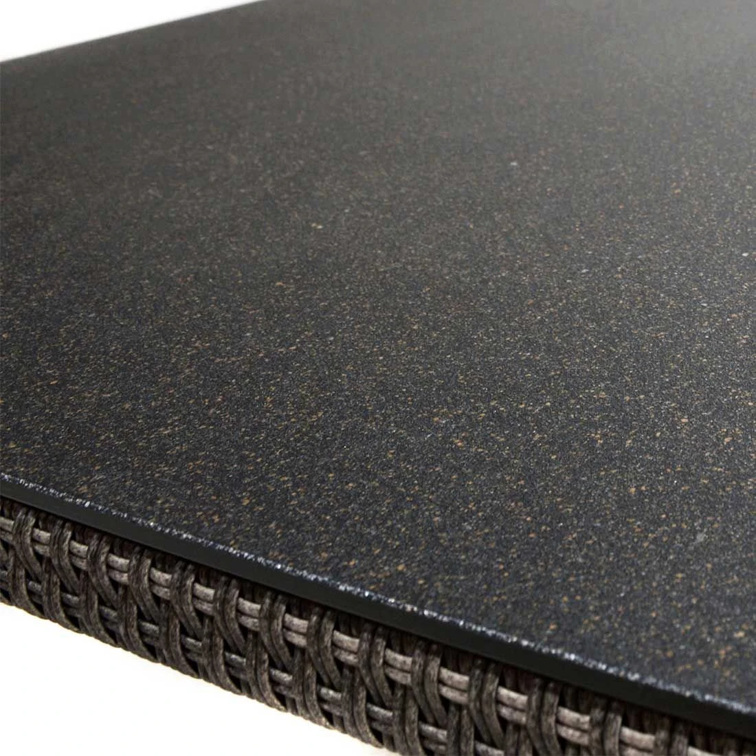 Das Gestell des eleganten Tisches besteht aus Aluminium. Farblich ist das Gestell in Natur-Beige-Braun-Meliert gehalten. Für die Herstellung der Tischplatte wird robustes Glas verwendet. Farblich ist die Tischplatte in einem schönen Steinoptik gehalten. Mit der rechteckigen Form lässt sich der Gartentisch platzsparend in Ecken oder an Häuserwänden aufstellen.
