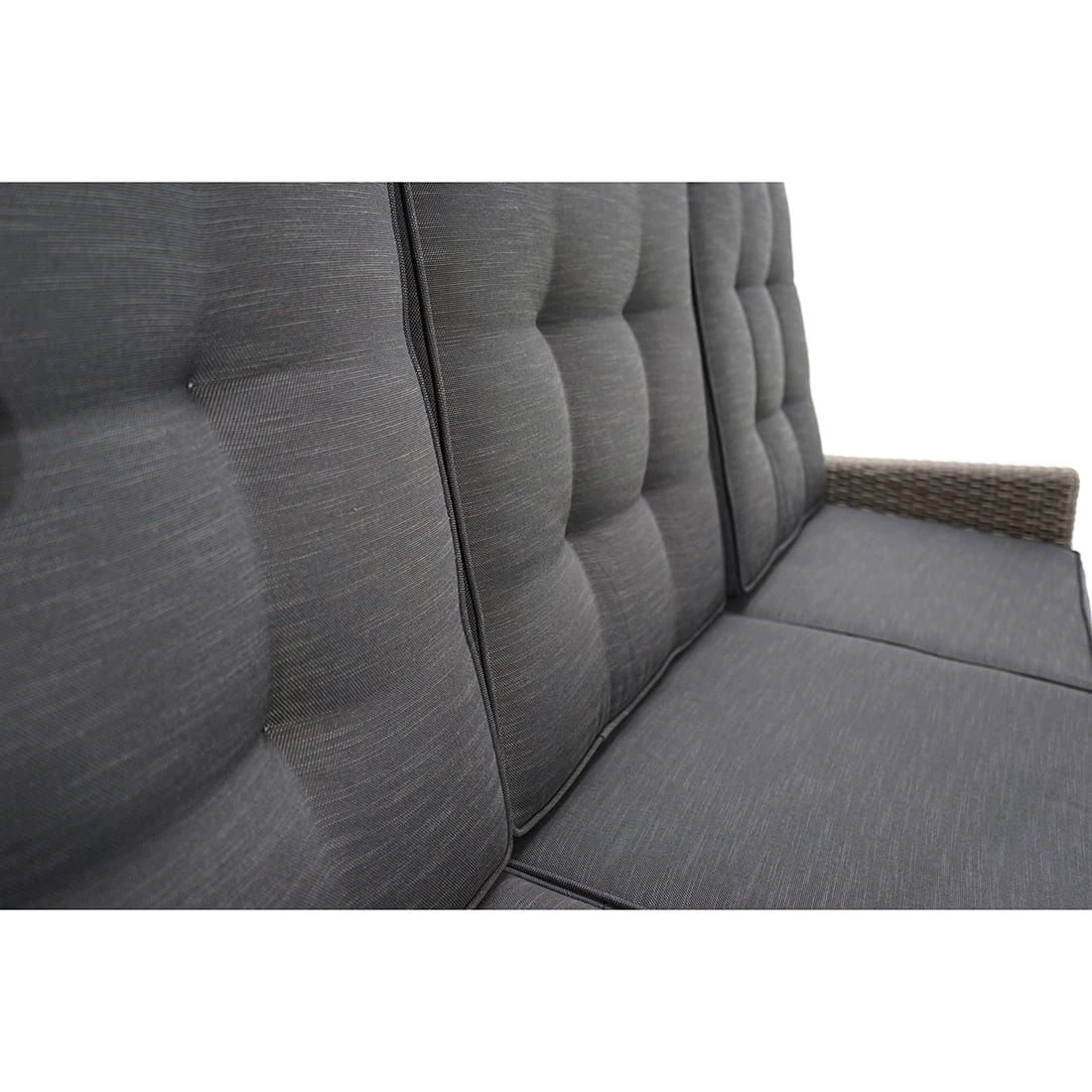 Der Korpus und die Sitzfläche bestehen aus Polyrattan-Geflecht. Das Gestell besteht aus pflegeleichtem und wetterfestem Aluminium. Für eine attraktive Optik ist das Gestell im Farbton Braun-Meliert gehalten. Als hochwertiges Material für den Bezug kommt ein Polyester-Stoff zum Einsatz. Er ist sehr strapazierfähig und bietet somit die idealen Voraussetzungen für den Einsatz im Freien. Farblich begeistert der Bezug in elegantem Anthrazit. Damit das Gartensofa optisch ansprechend ist, sind der Korpus und die Sitzfläche im Farbton Grau-Braun-Meliert gehalten.