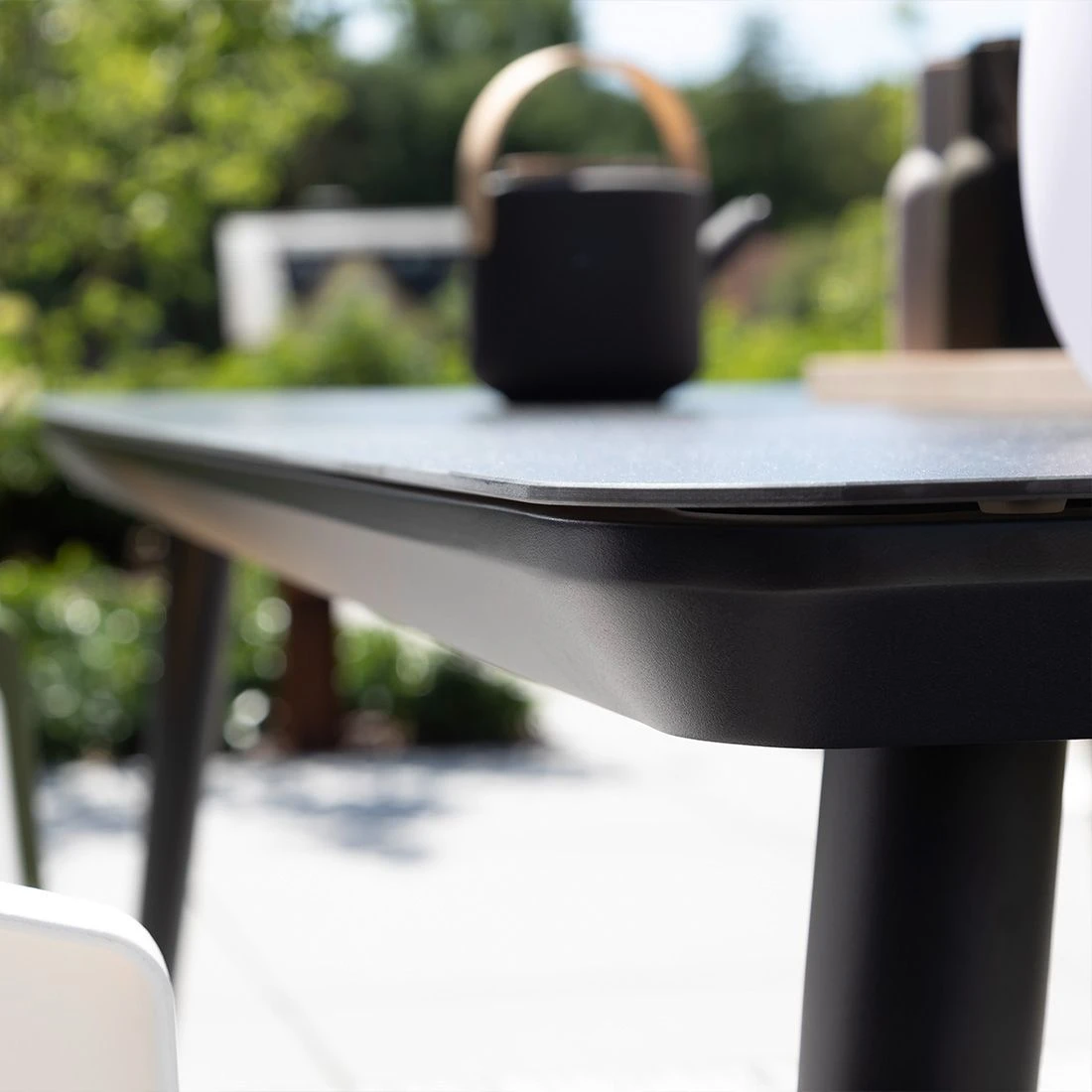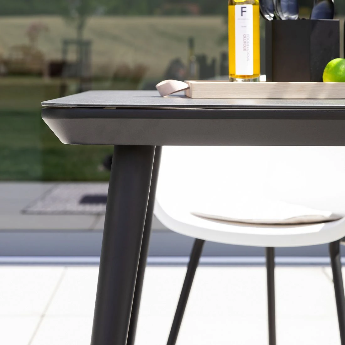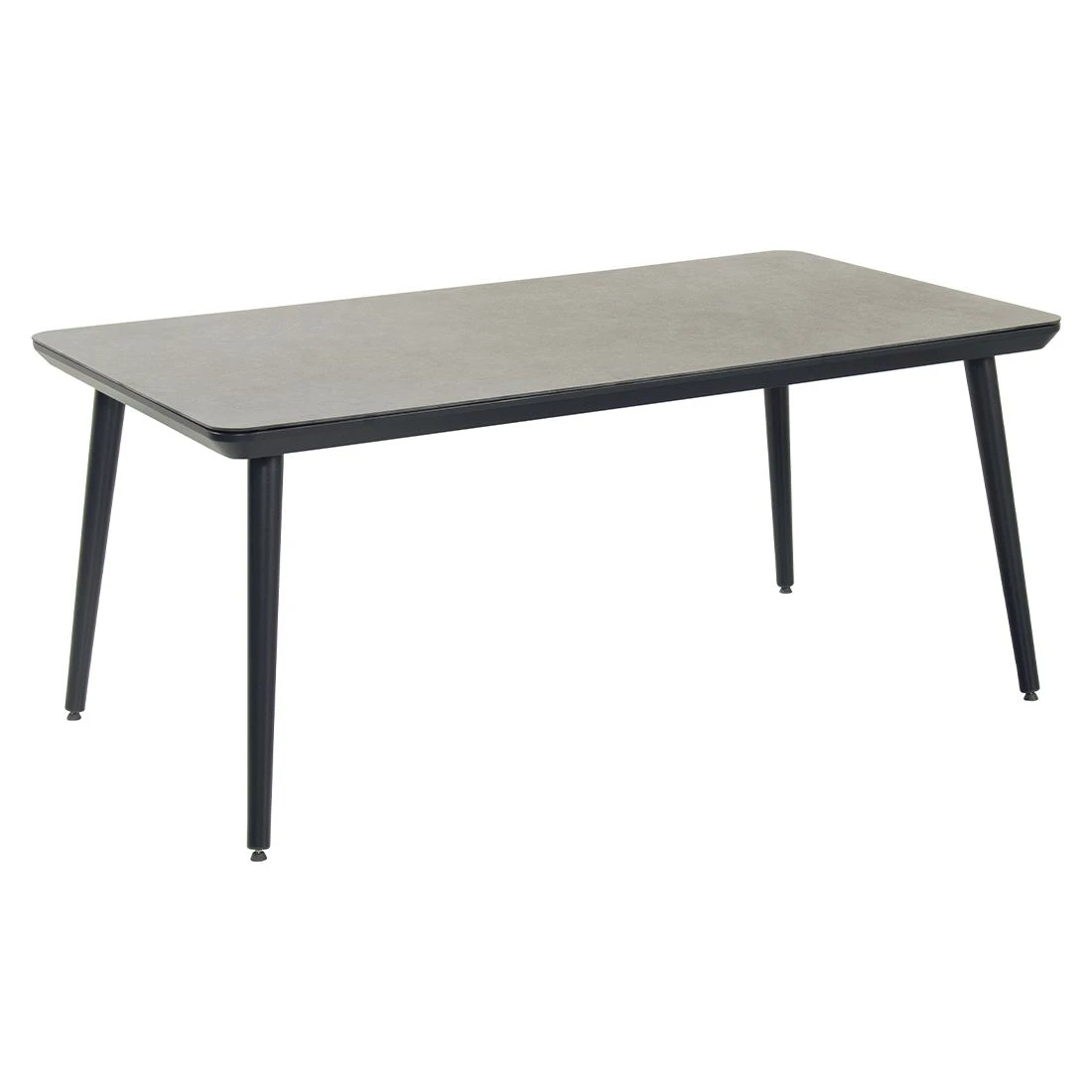 Das Gestell des attraktiven Tisches besteht aus Aluminium. Klassisch aus vier Tischbeinen besteht das Gestell des Tisches. Für die Tischplatte wird hochwertiges Keramik-Glas verarbeitet, welches auf der Terrasseeine angenehme Wohlfühl-Atmosphäre verbreitet. Farblich ist die Tischplatte in einem schönen Keramik Grau gehalten. Mit der rechteckigen Form lässt sich der Gartentisch platzsparend in Ecken oder an Häuserwänden aufstellen.