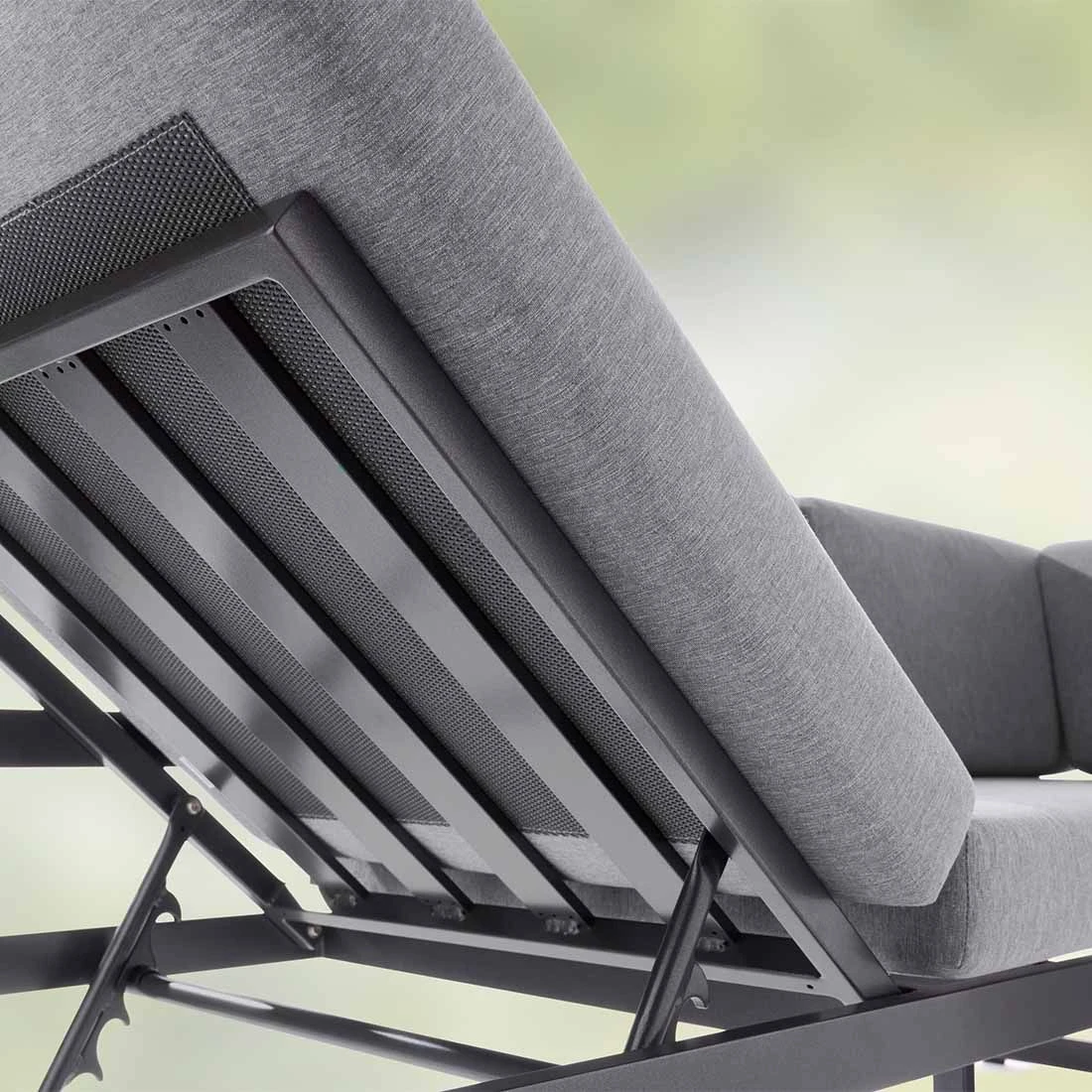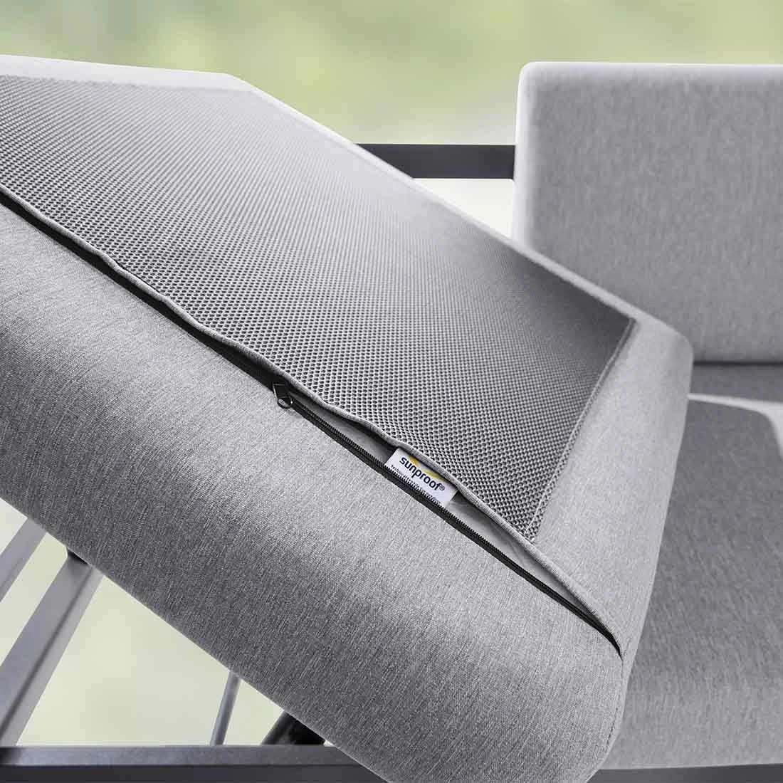 Das Gestell ist aus Aluminium hergestellt. Optisch begeistert das Gestell in der Farbe Eisengrau. Die Sitzfläche ist aus dem wasserabweisenden Markenstoff Sunproof gefertigt und damit auch besonders gut vor dem Ausbleichen geschützt.
