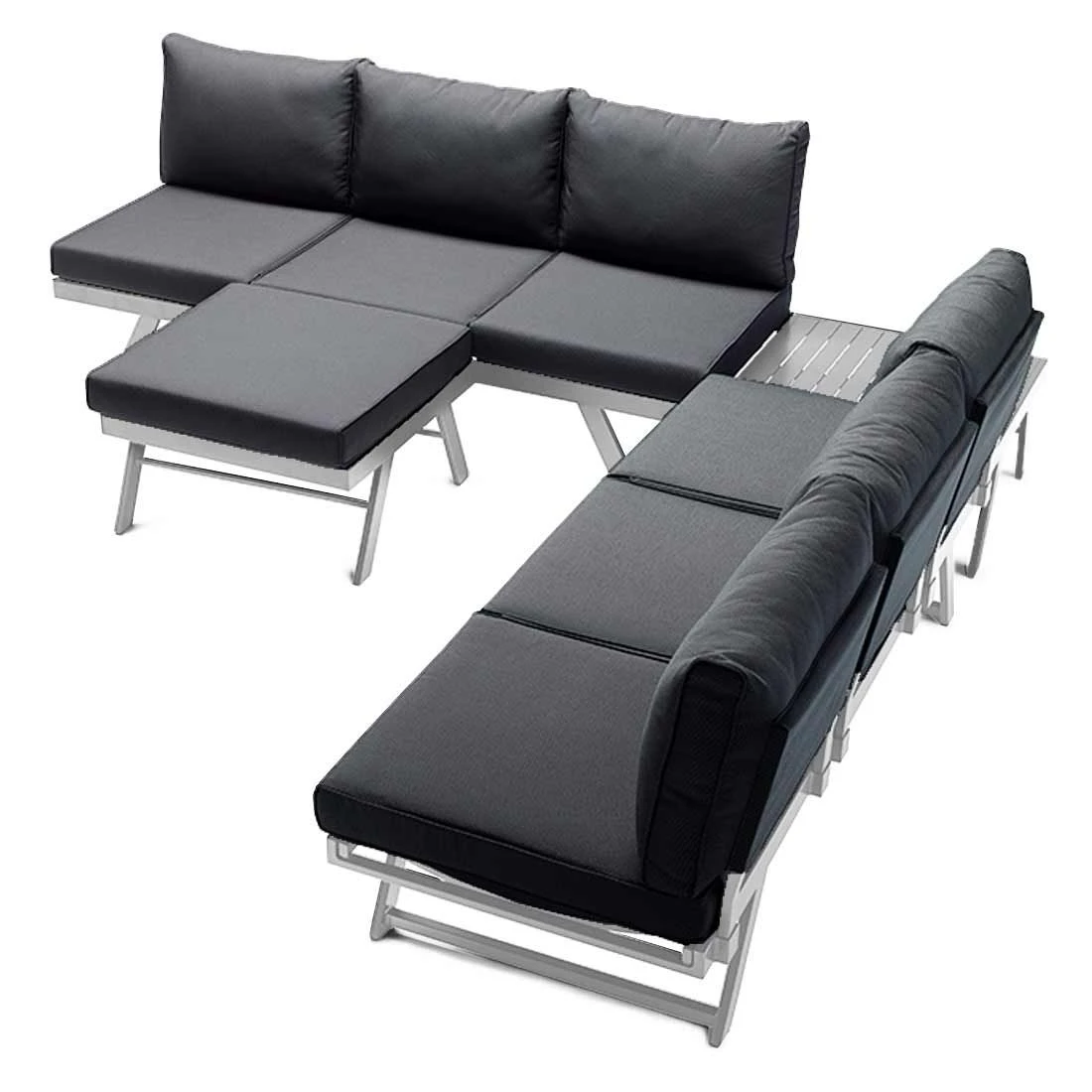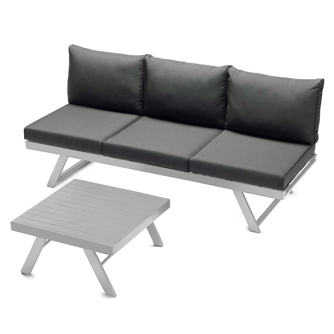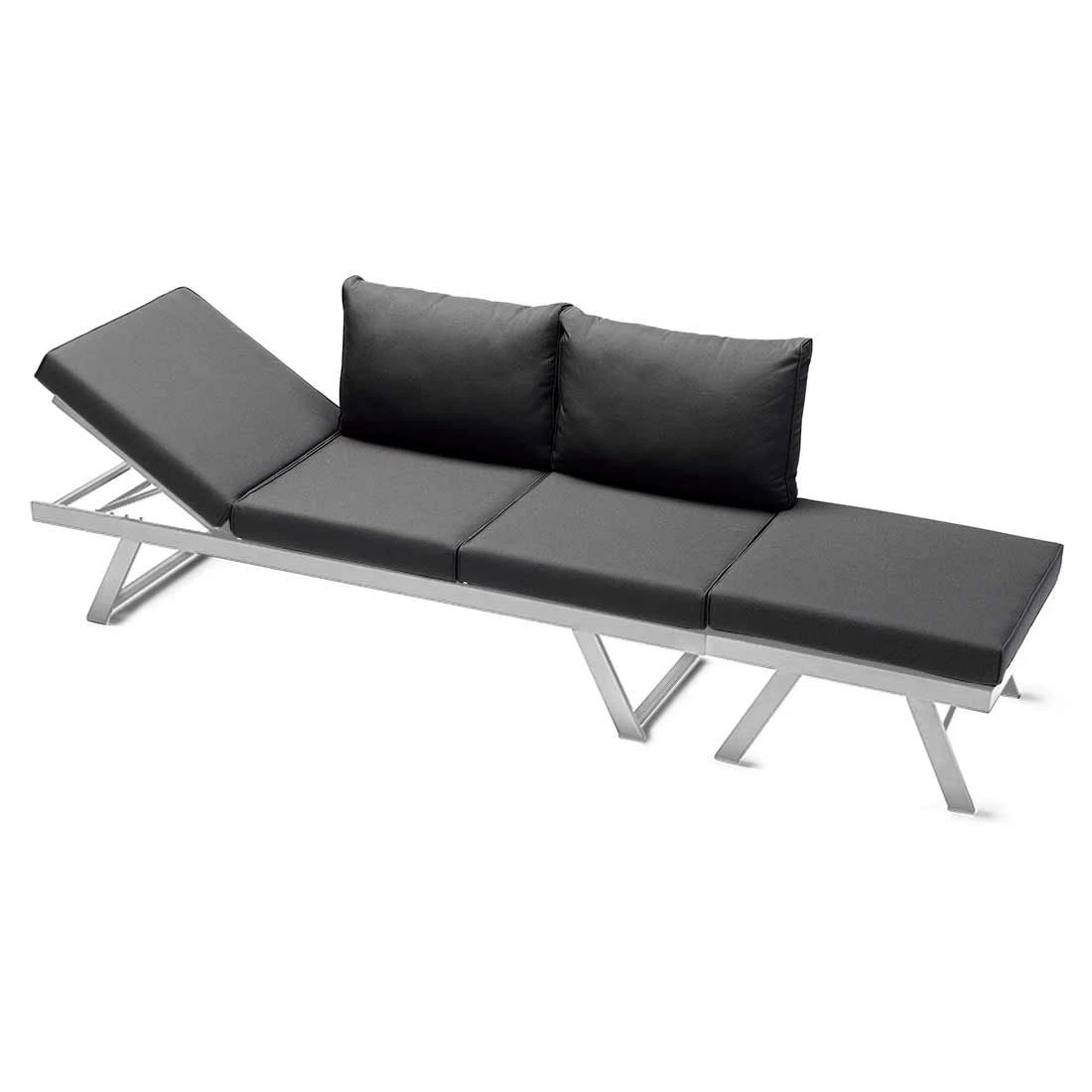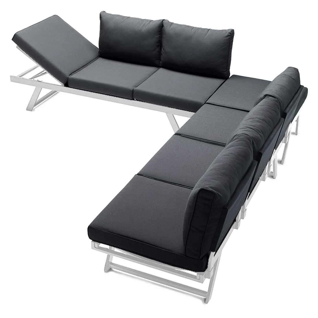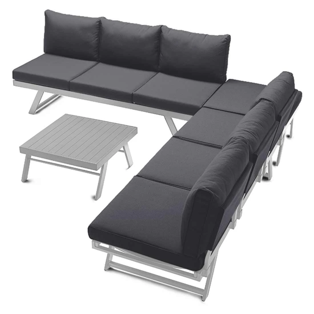 Das Gestell und die Tischplatte sind aus Aluminium gefertigt. Damit die Ecklounge optisch ansprechend ist, sind das Gestell und die Sitzfläche im Farbton Graphit gehalten. Die Bezüge sind aus dem wasserabweisenden Markenstoff Sunproof gefertigt und damit auch besonders lichtecht und UV-beständig. Die Farbe des Bezugs ist Grau.
