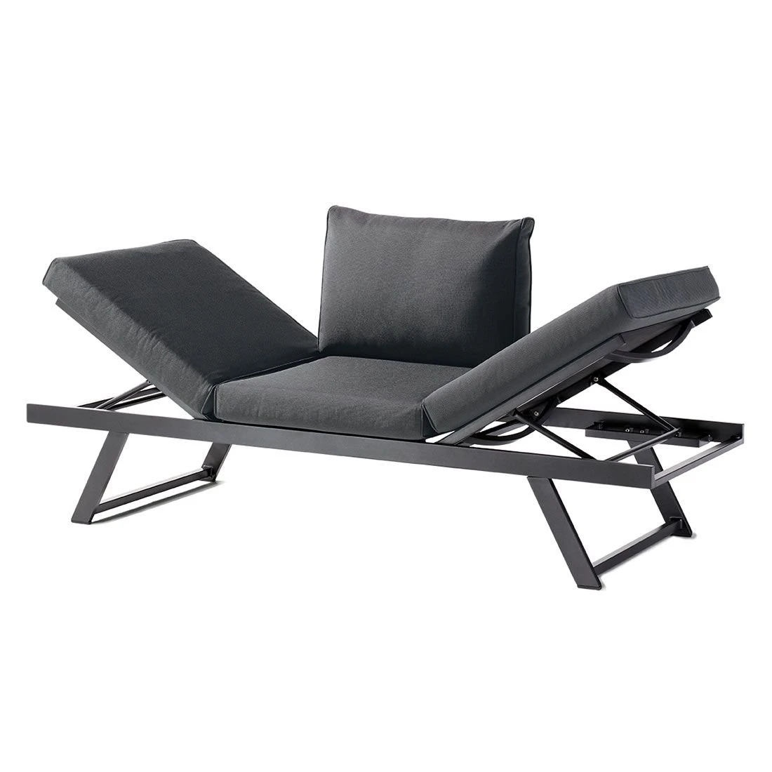Das Gestell ist aus Aluminium hergestellt. Optisch begeistert das Gestell in der Farbe Eisengrau. Die Bezüge sind aus dem wasserabweisenden Markenstoff Sunproof gefertigt und damit auch besonders gut vor dem Ausbleichen geschützt. Die Farbe des Bezugs ist Grau.