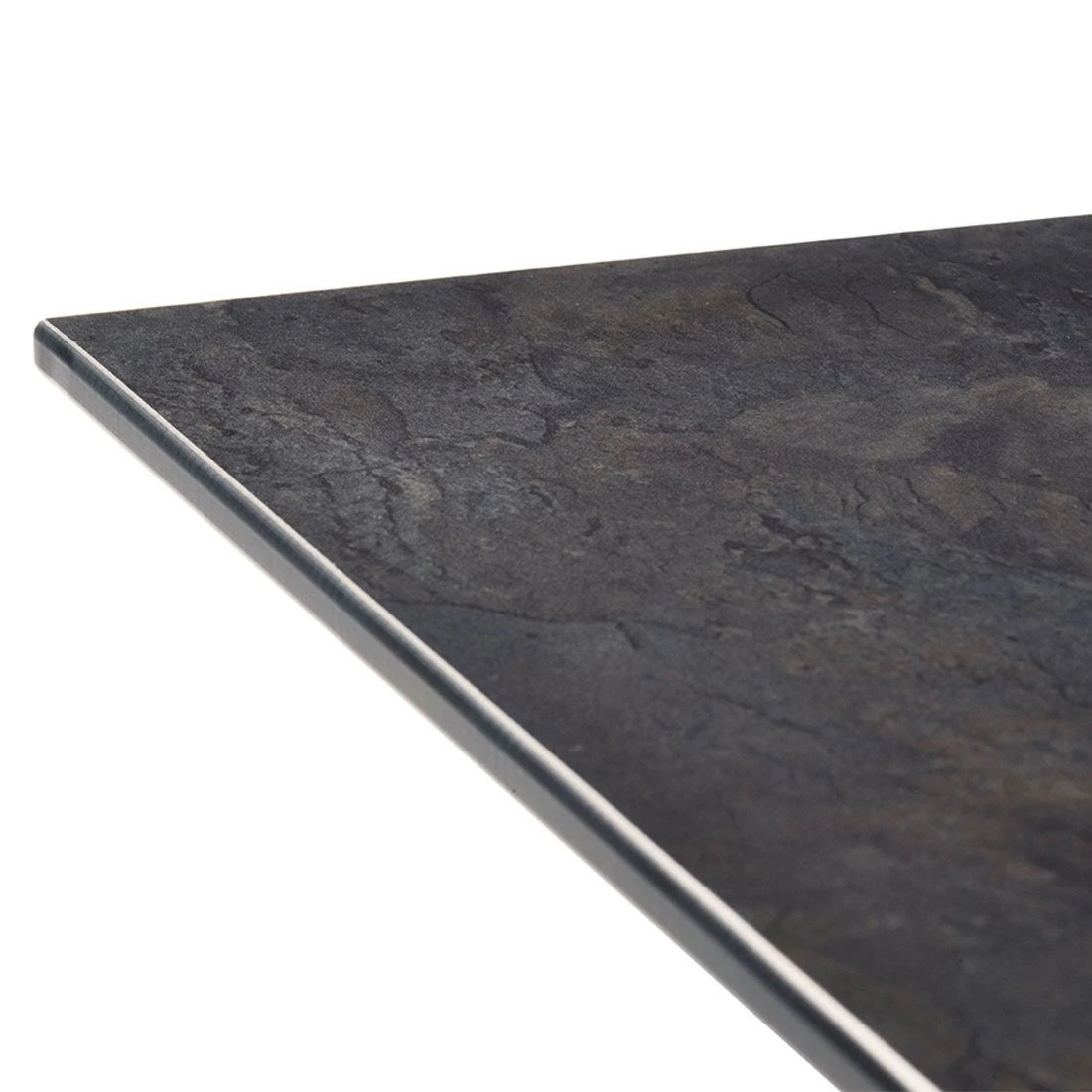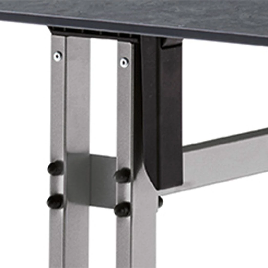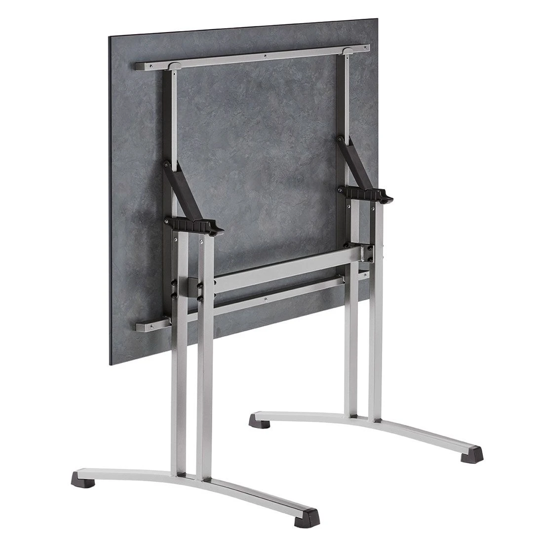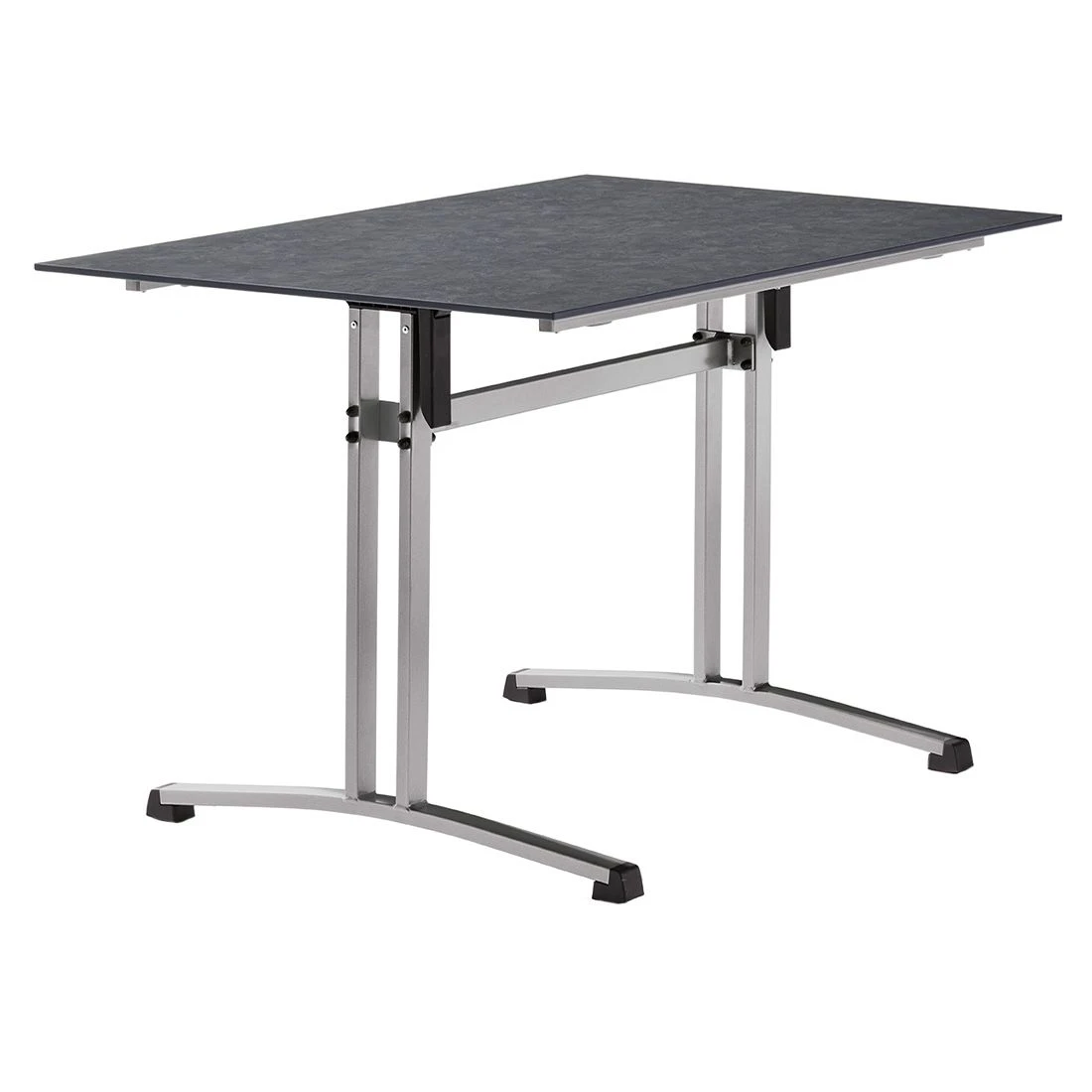 Optisch ist das Gestell in Graphit gehalten. Die Tischplatte ist aus Polytec gefertigt. Es handelt sich dabei um eine besonders robuste HPL-Platte, die durch ihre Materialeigenschaften bestens für den Einsatz im Freien geeignet ist. Die Platte ist wetter-, kälte-, schlag- und kratzfest und zudem auch noch pflegeleicht. Farblich ist die Platte in Schiefer Anthrazit gehalten. Das klassische Vierfuß-Gestell garantiert Ihnen maximale Beinfreiheit. Die Form des Klapptisches ist klassisch rechteckig gehalten.