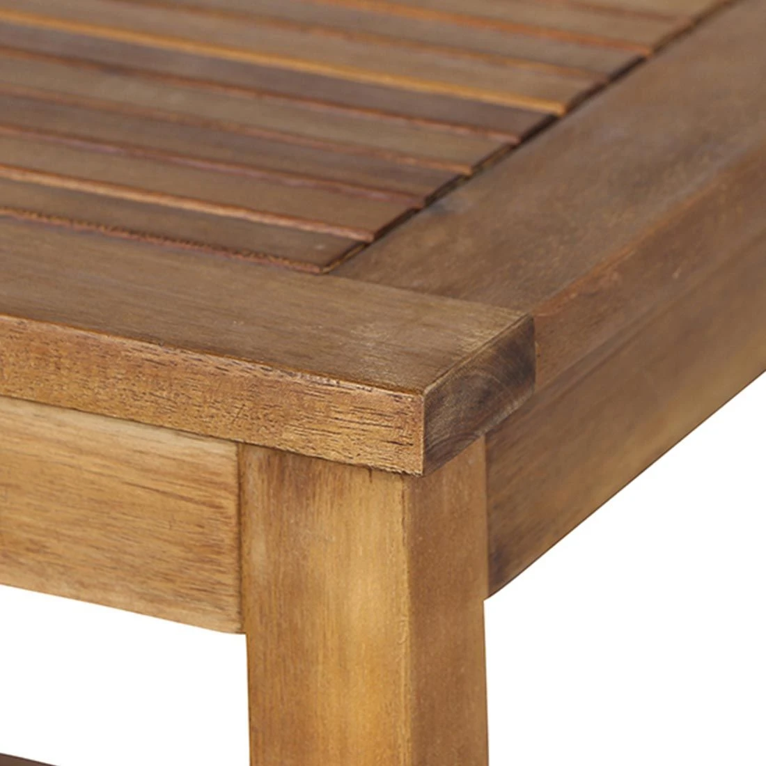 Klassisch aus vier Tischbeinen besteht das Gestell des Tisches. Der Beistelltisch ist komplett aus Akazienholz gefertigt und gibt so ein charmantes, einheitliches Bild auf der Terrasse ab. Farblich ist die Platte in Akazie geölt gehalten. Die Form des Beistelltischs ist kompakt quadratisch gehalten.